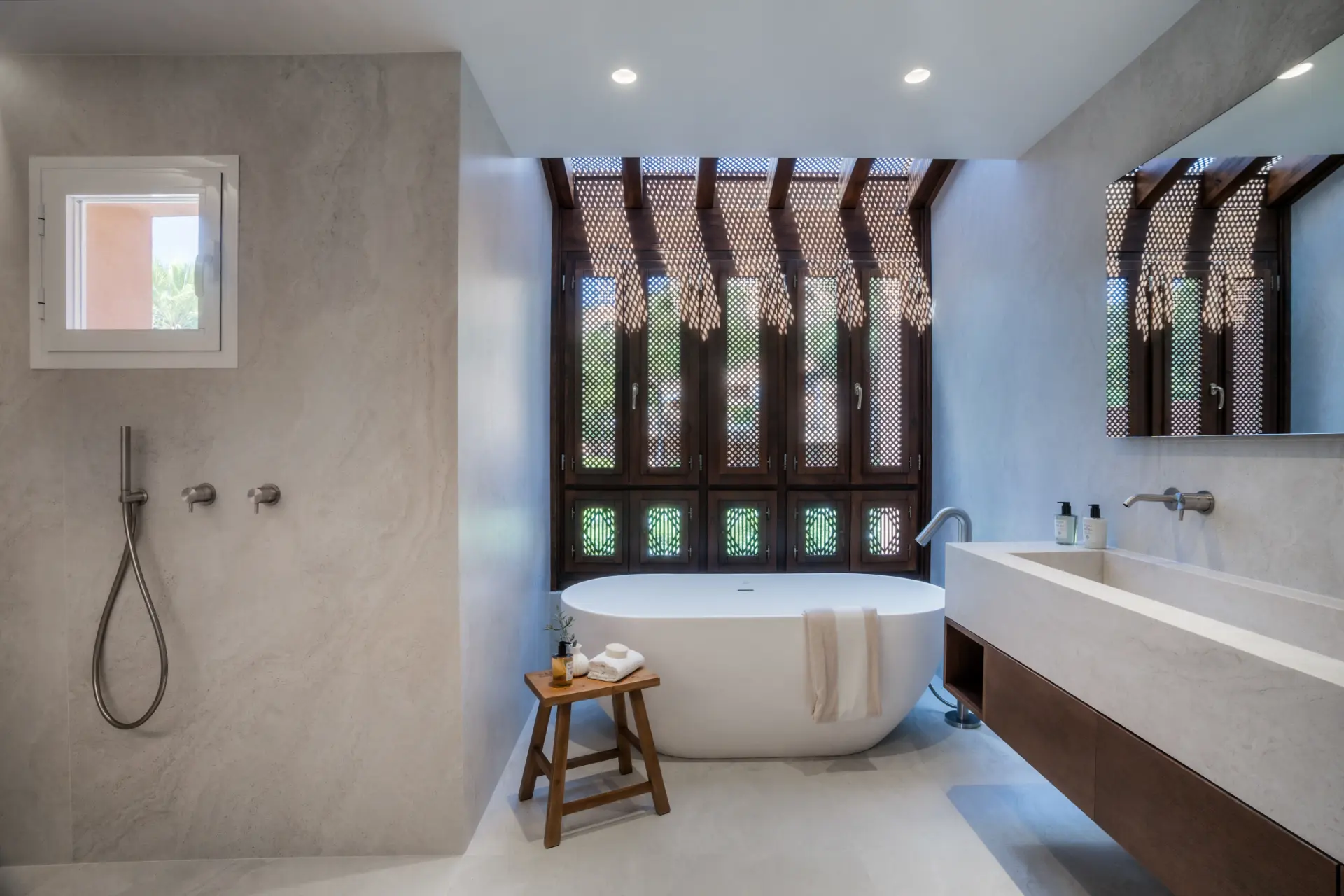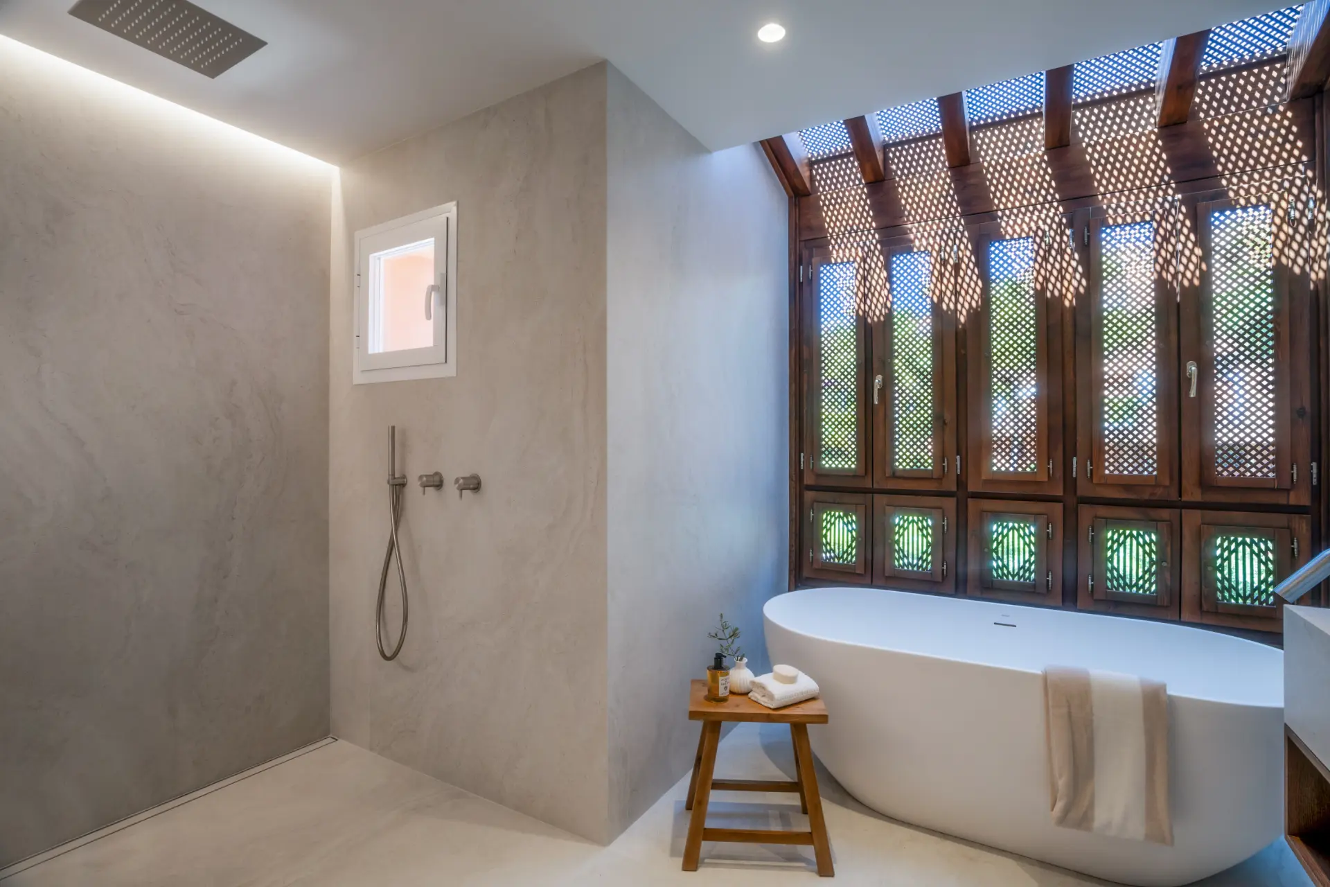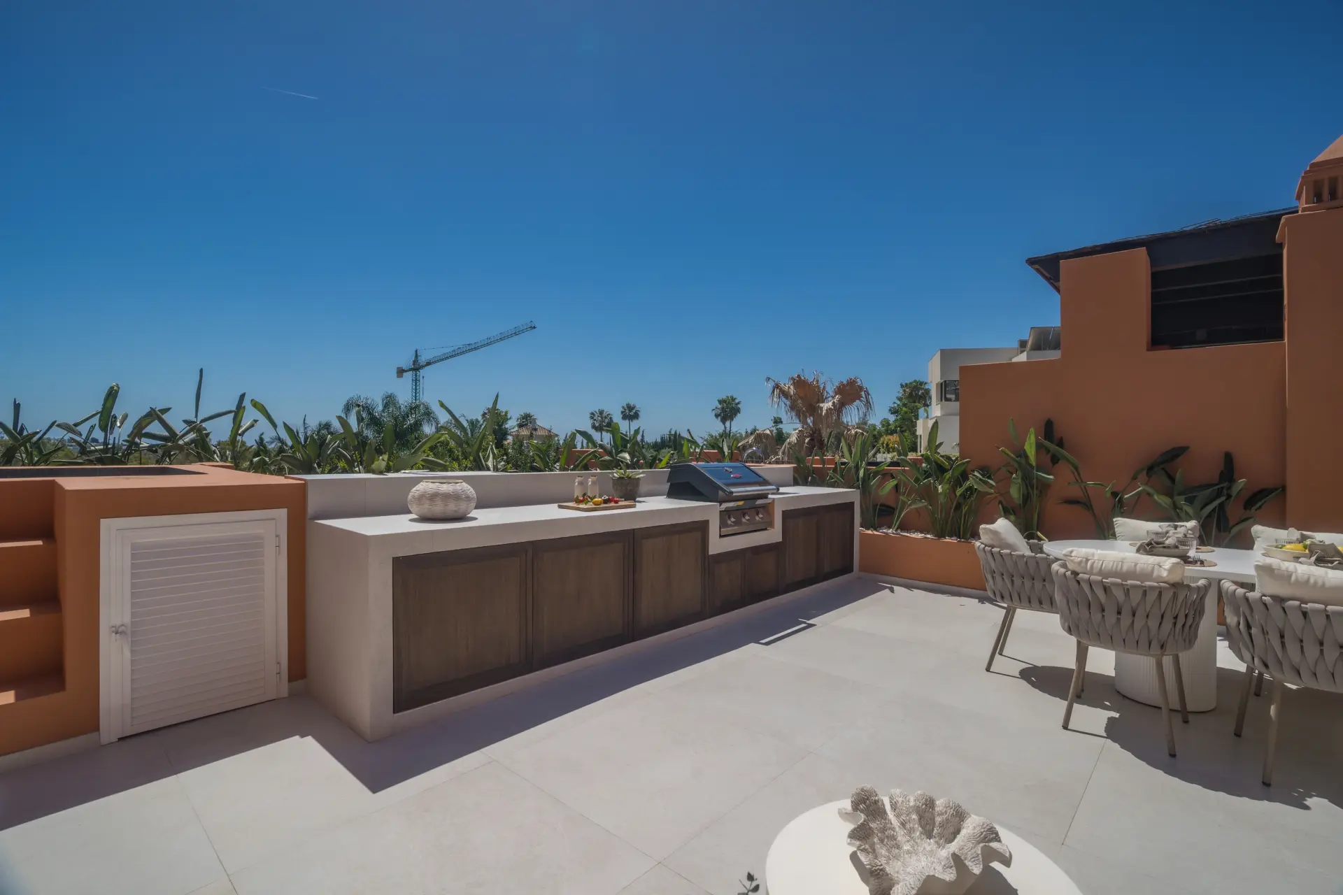 The upper level is dedicated to the master suite, complete with a walk-in wardrobe, a generous en-suite bathroom, and direct access to an expansive private terrace. Designed for year-round enjoyment, this outdoor space features a plunge pool, outdoor kitchen with barbecue, dining area, and multiple lounge zones. South-facing and thoughtfully arranged, it offers both privacy and comfort while enjoying open views.