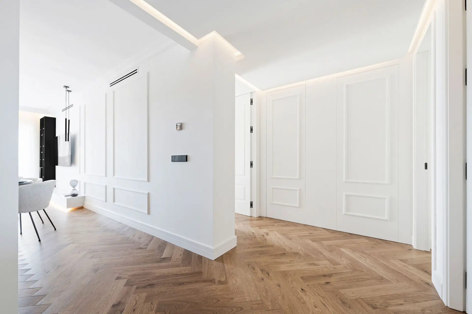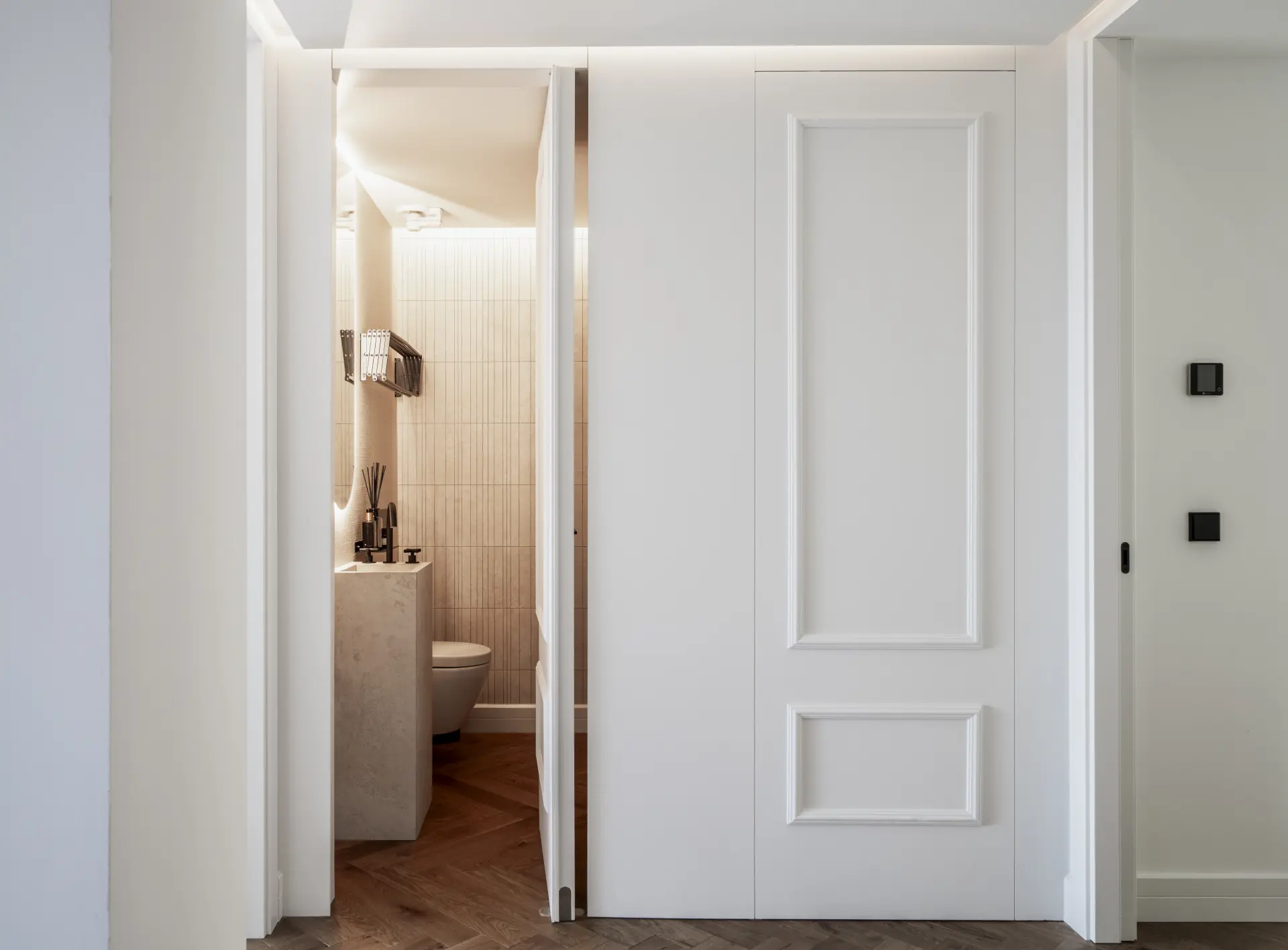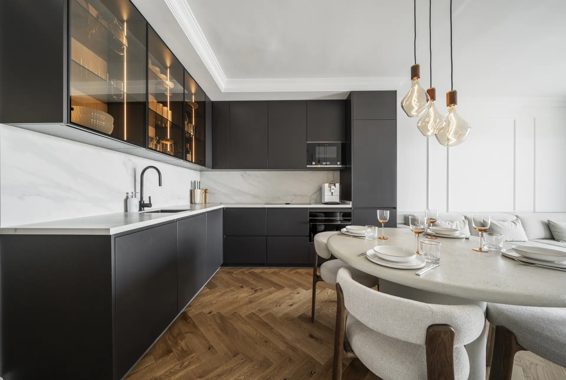 Interiors follow a calm, contemporary aesthetic, with herringbone wood flooring and a restrained material palette adding warmth without excess. The kitchen is fully integrated within the main living space, designed for both everyday use and informal entertaining.