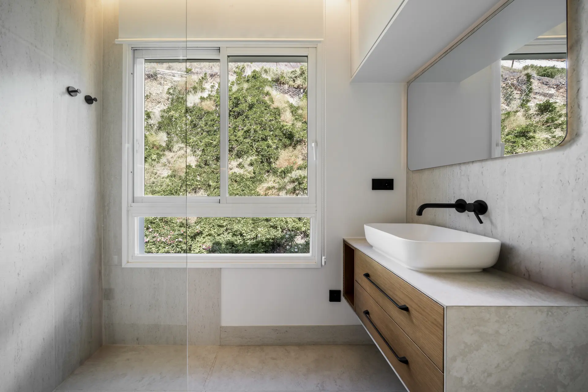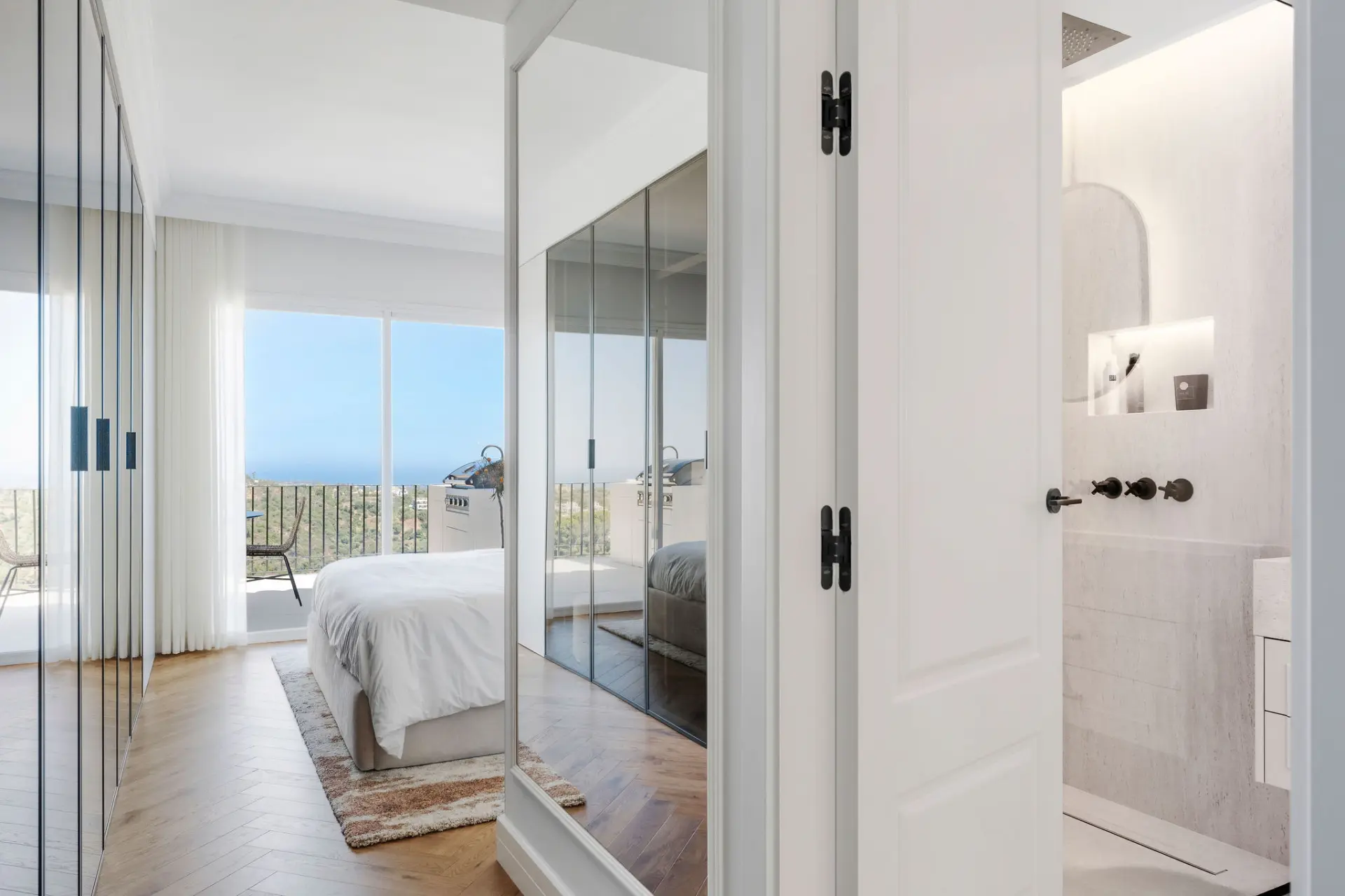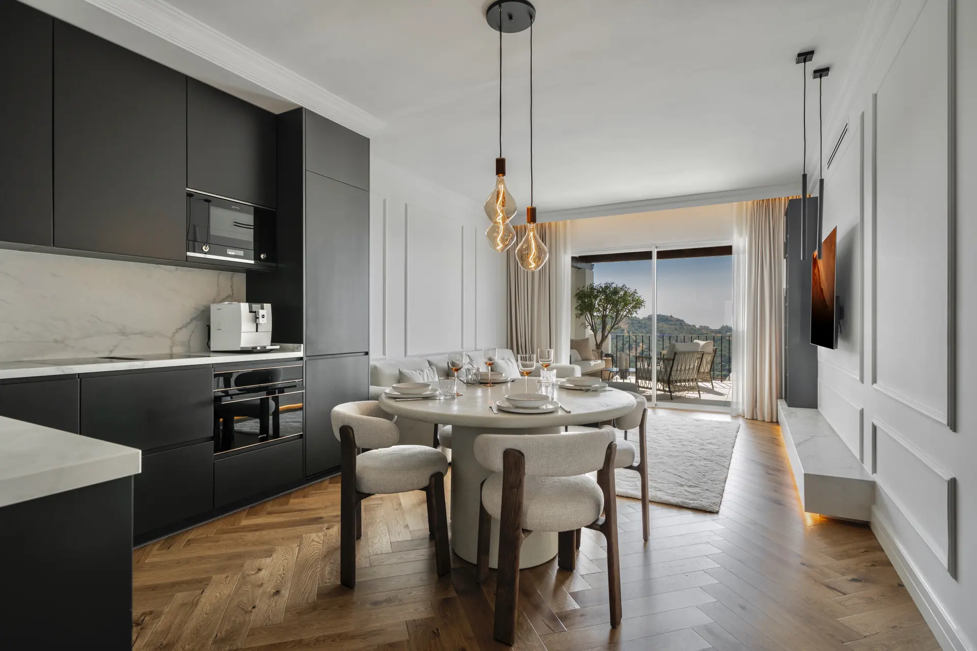 The layout is straightforward and functional. Living and dining areas are arranged in an open plan, connecting directly to a private terrace that extends the space outward and captures open views across the mountains and towards the Mediterranean. The south-east orientation ensures consistent natural light throughout the day.