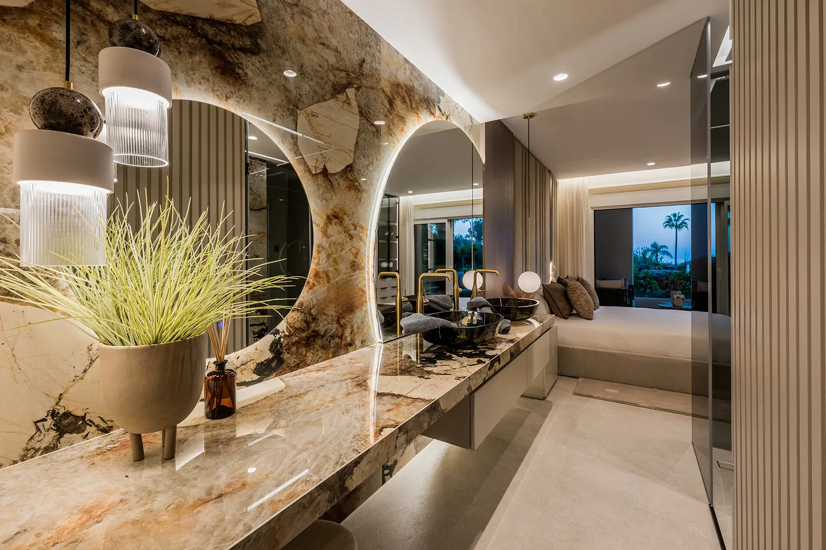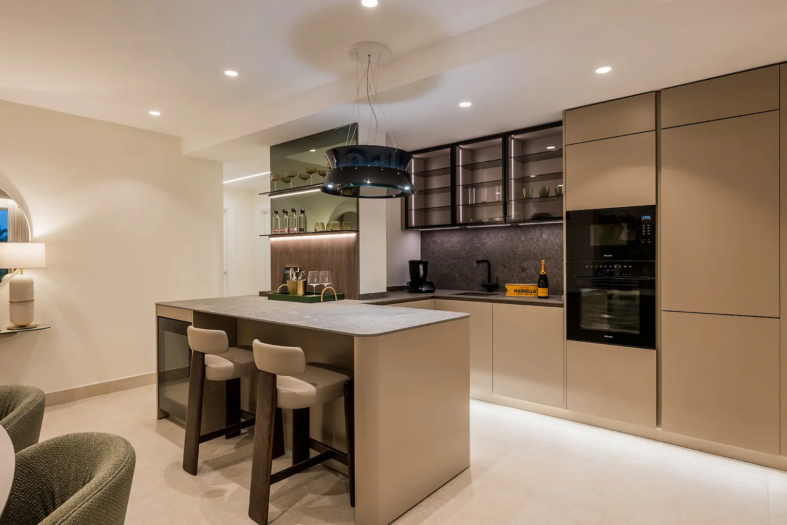 The apartment spans 126 m² of built space and includes three bedrooms and two bathrooms, thoughtfully designed for comfort and privacy. Interiors feature high-quality finishes, including an electric fireplace, Bang & Olufsen sound system, Japanese toilets, and a designer kitchen equipped with a Thermomix and invisible hob. Custom walk-in wardrobes and a hidden laundry area add to the apartment’s practical elegance, while the open-plan living and dining area flows seamlessly onto the terrace, where sea views provide a calming backdrop.