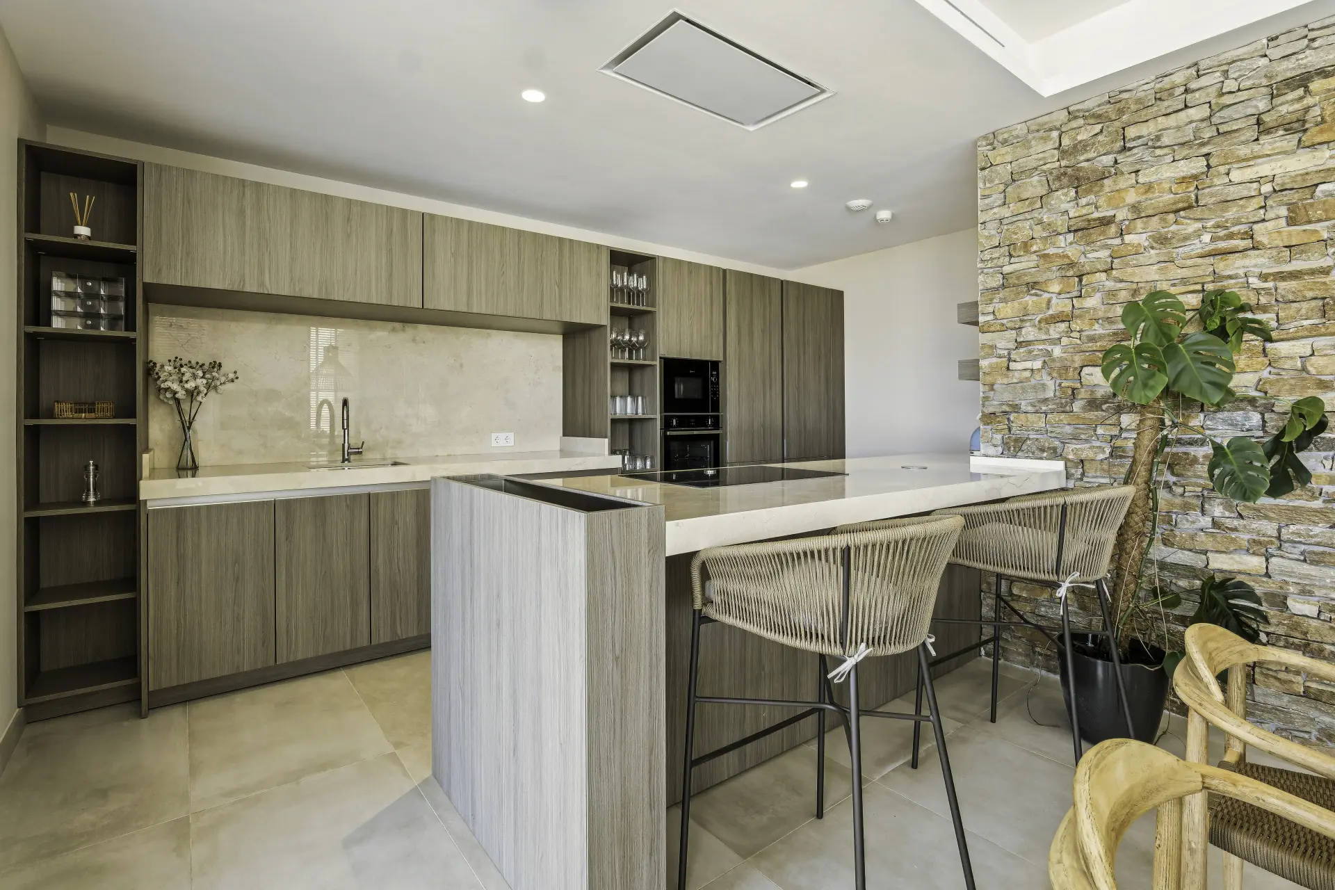 The main level is designed for open living, where the kitchen, dining and lounge areas connect directly to over 100 m² of terraces. Large sliding doors extend the space outdoors, leading to an infinity pool with open views of the Mediterranean.