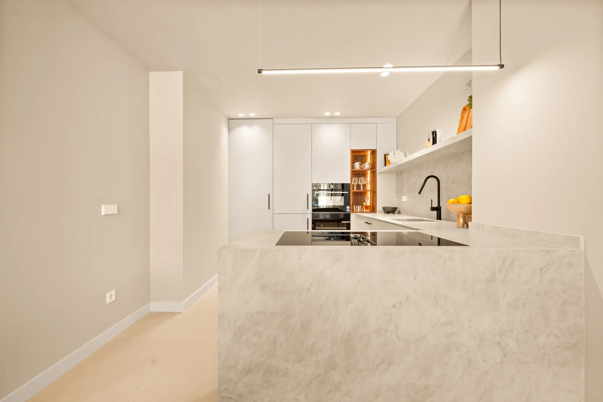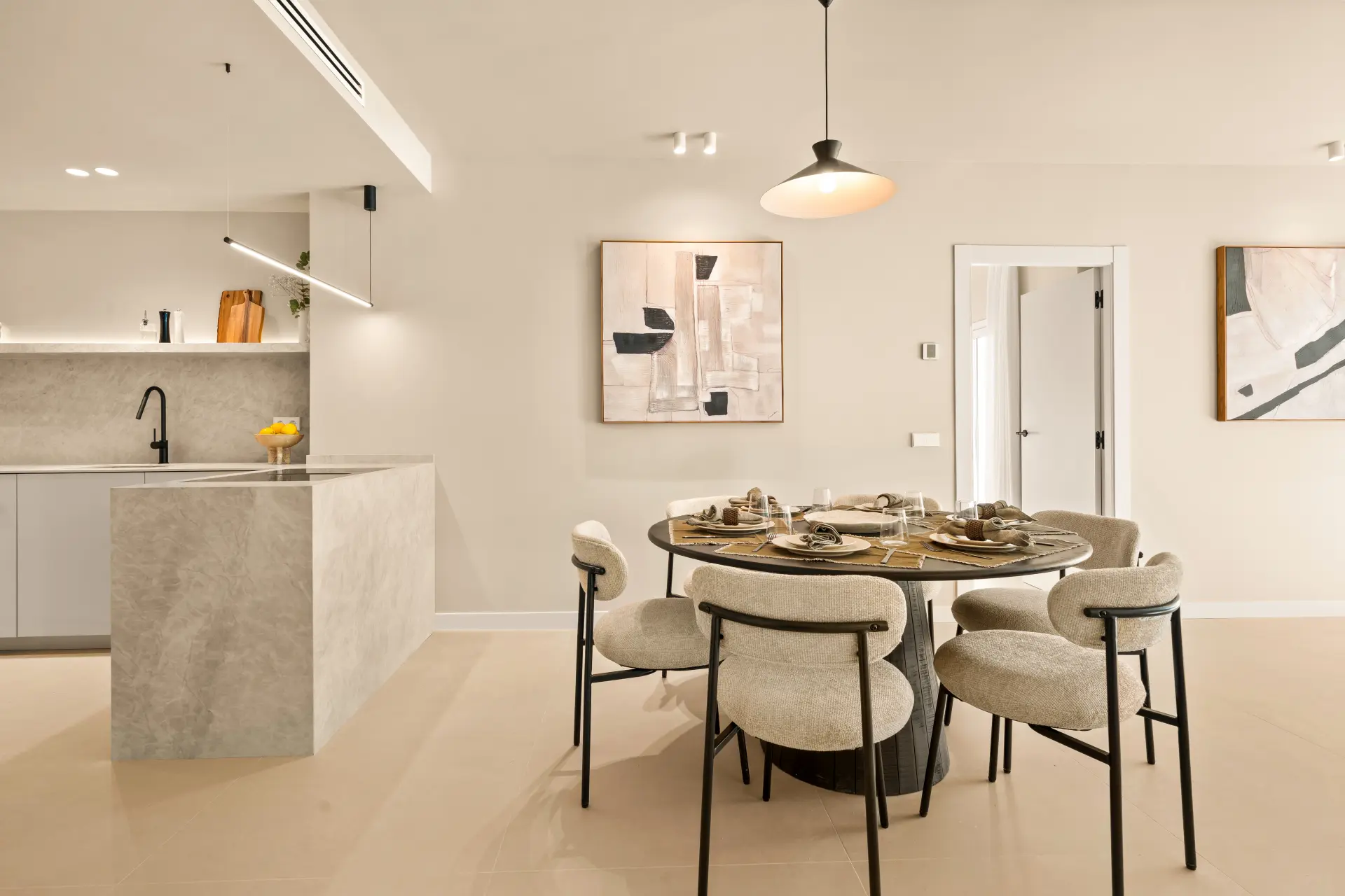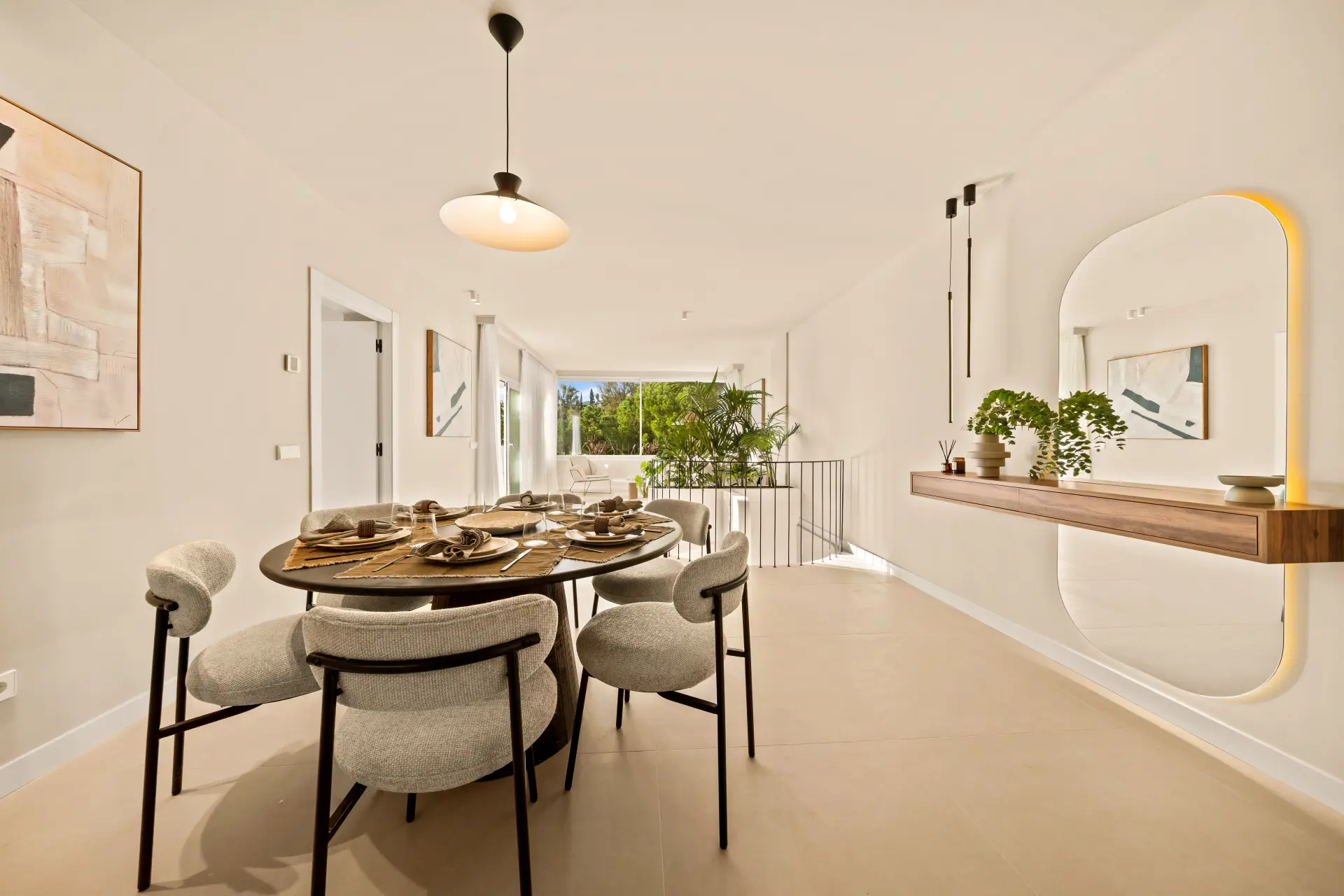 The home features three en-suite bedrooms, a guest toilet, and a sleek, fully fitted kitchen with brand-new appliances. Underfloor heating in all bathrooms and individual Airzone AC units in every room ensure year-round comfort. The south-west facing terrace includes a built-in BBQ, perfect for alfresco dining, while a private parking space adds convenience.