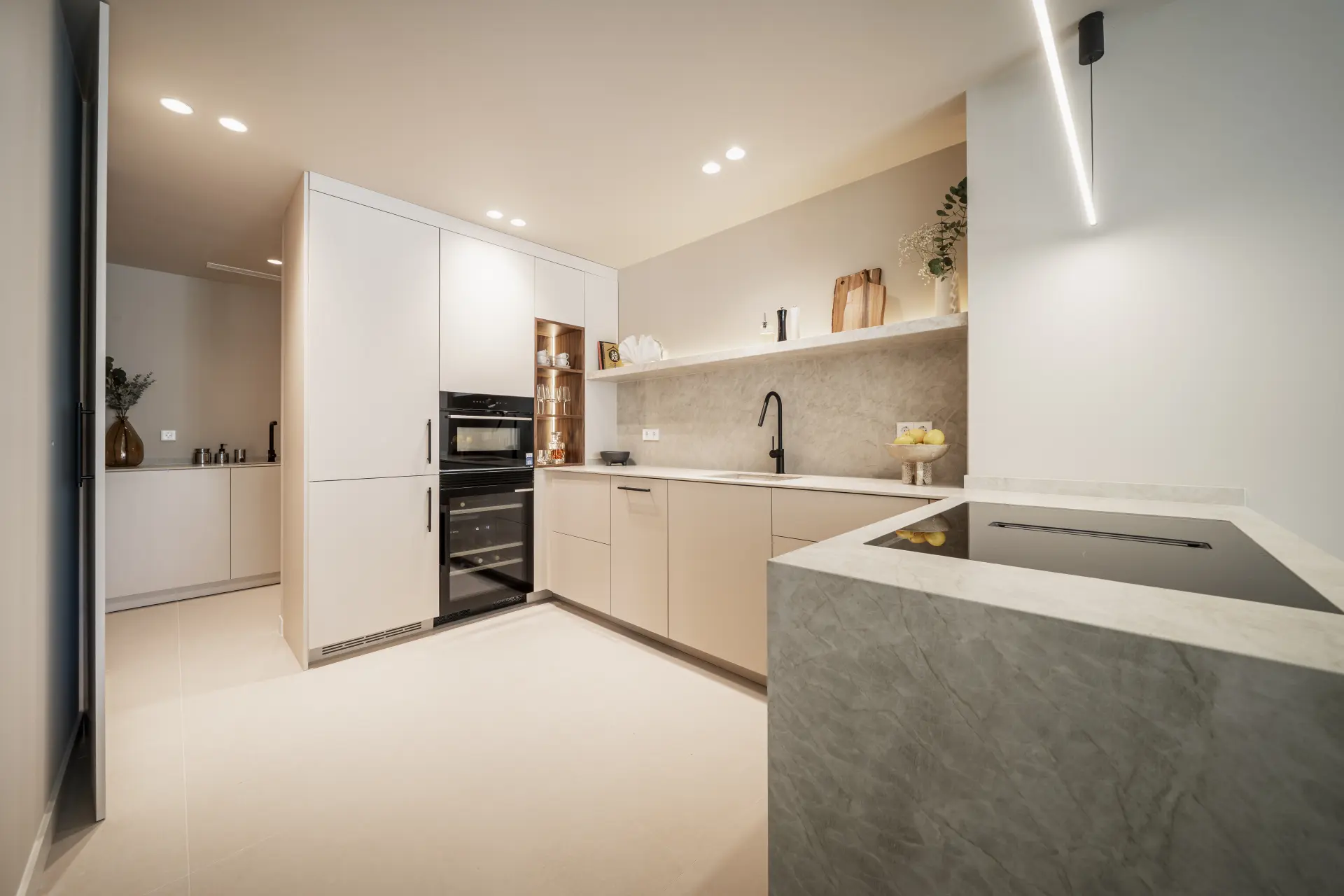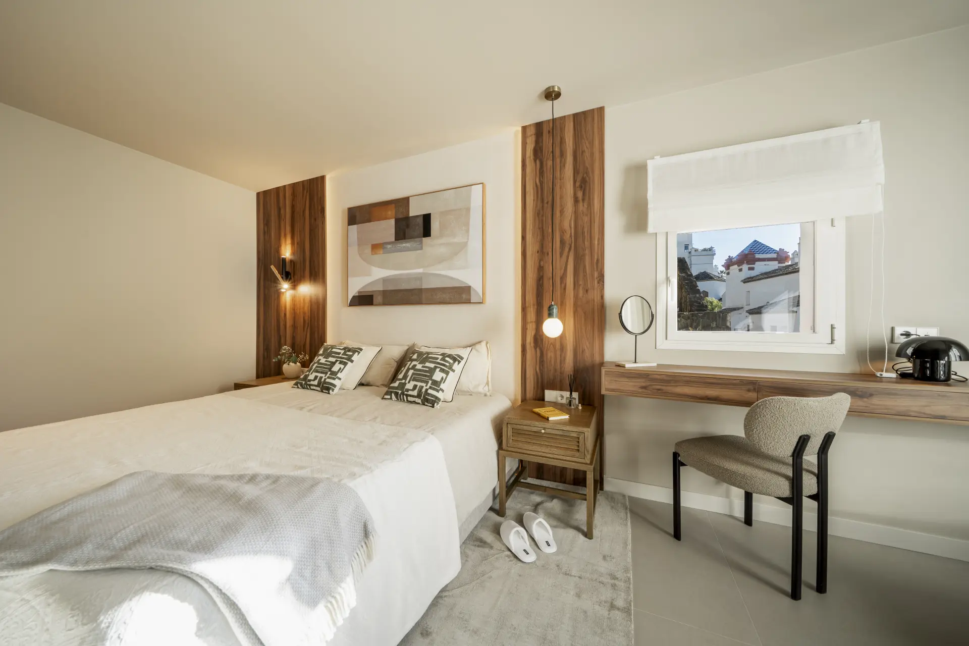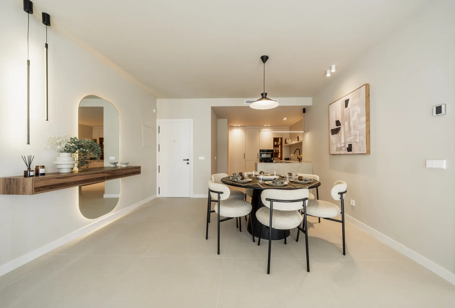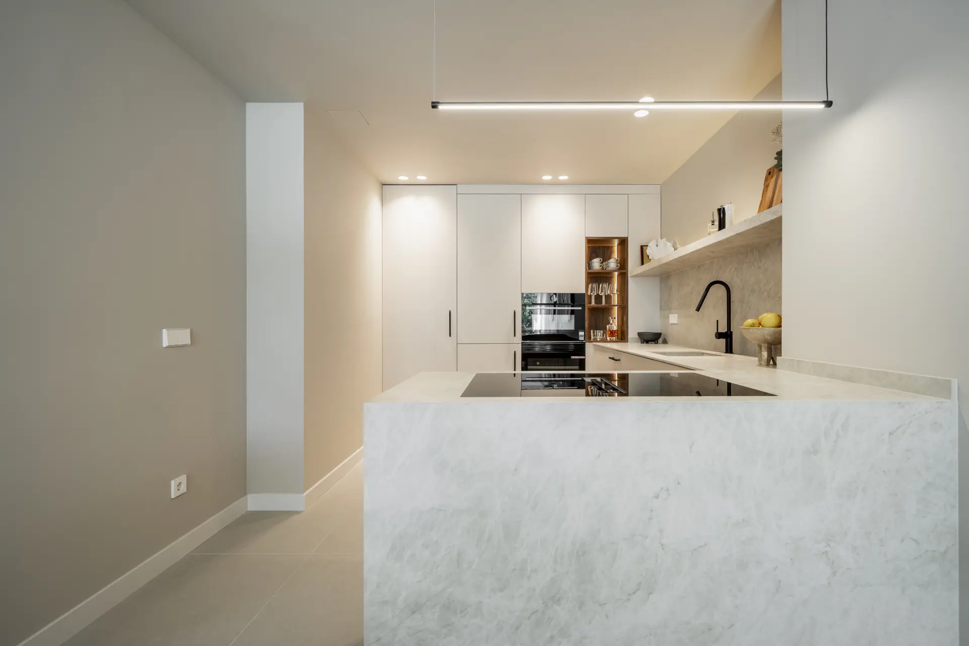 The apartment has been fully upgraded and is presented key-ready. Arranged over two levels, it offers three en-suite bedrooms and a guest toilet, creating a practical distribution for both private use and short-term stays. The interior follows a clean, contemporary approach, with a fully fitted kitchen equipped with new appliances and open living areas that connect directly to a south-west facing terrace.