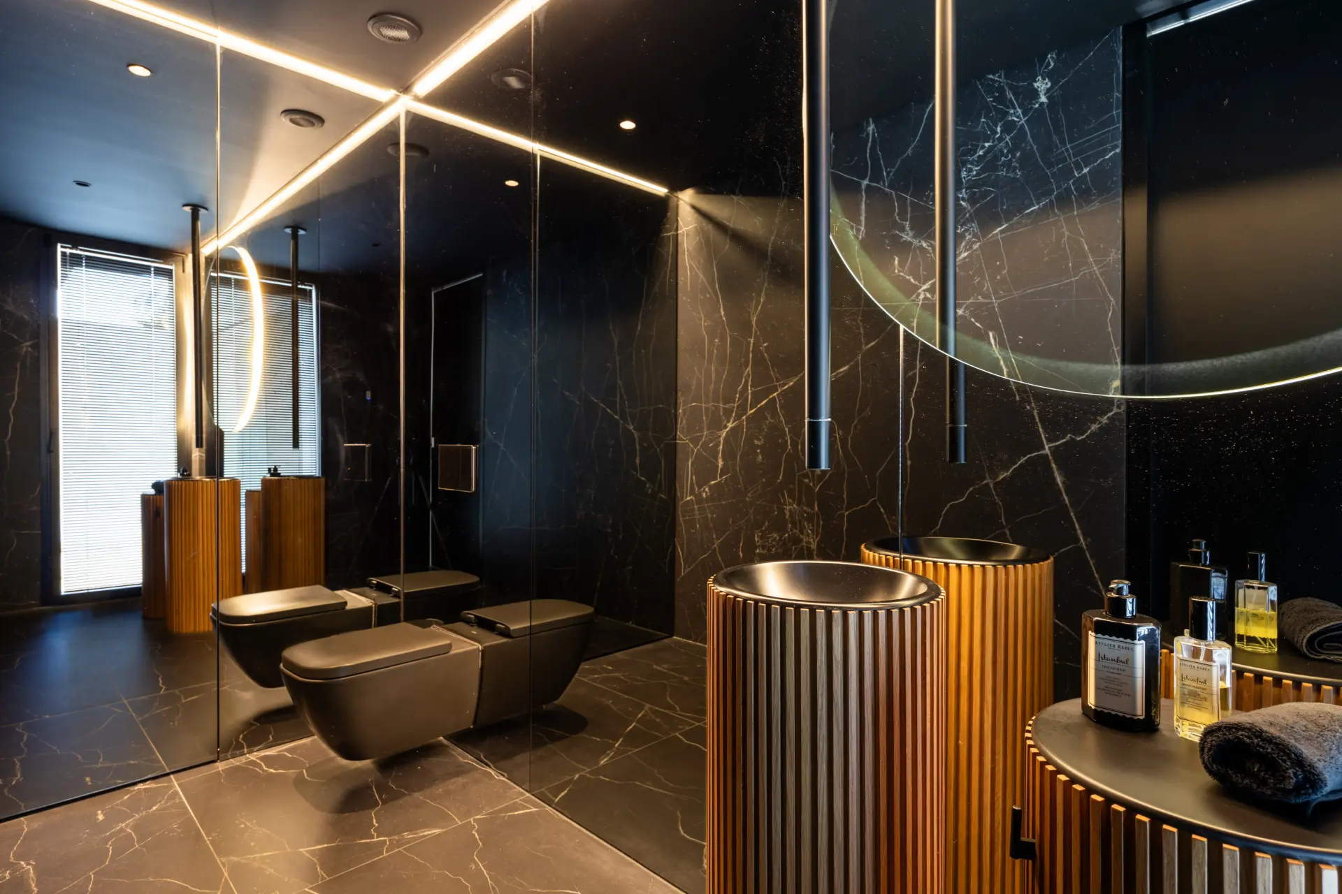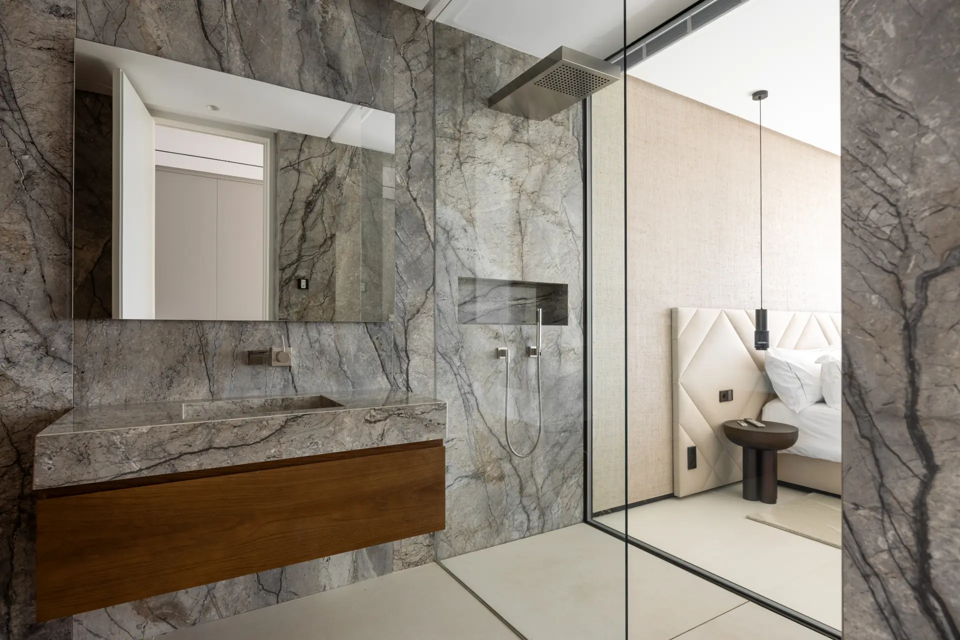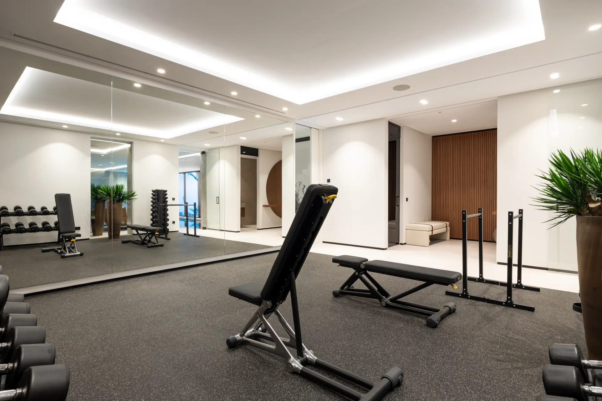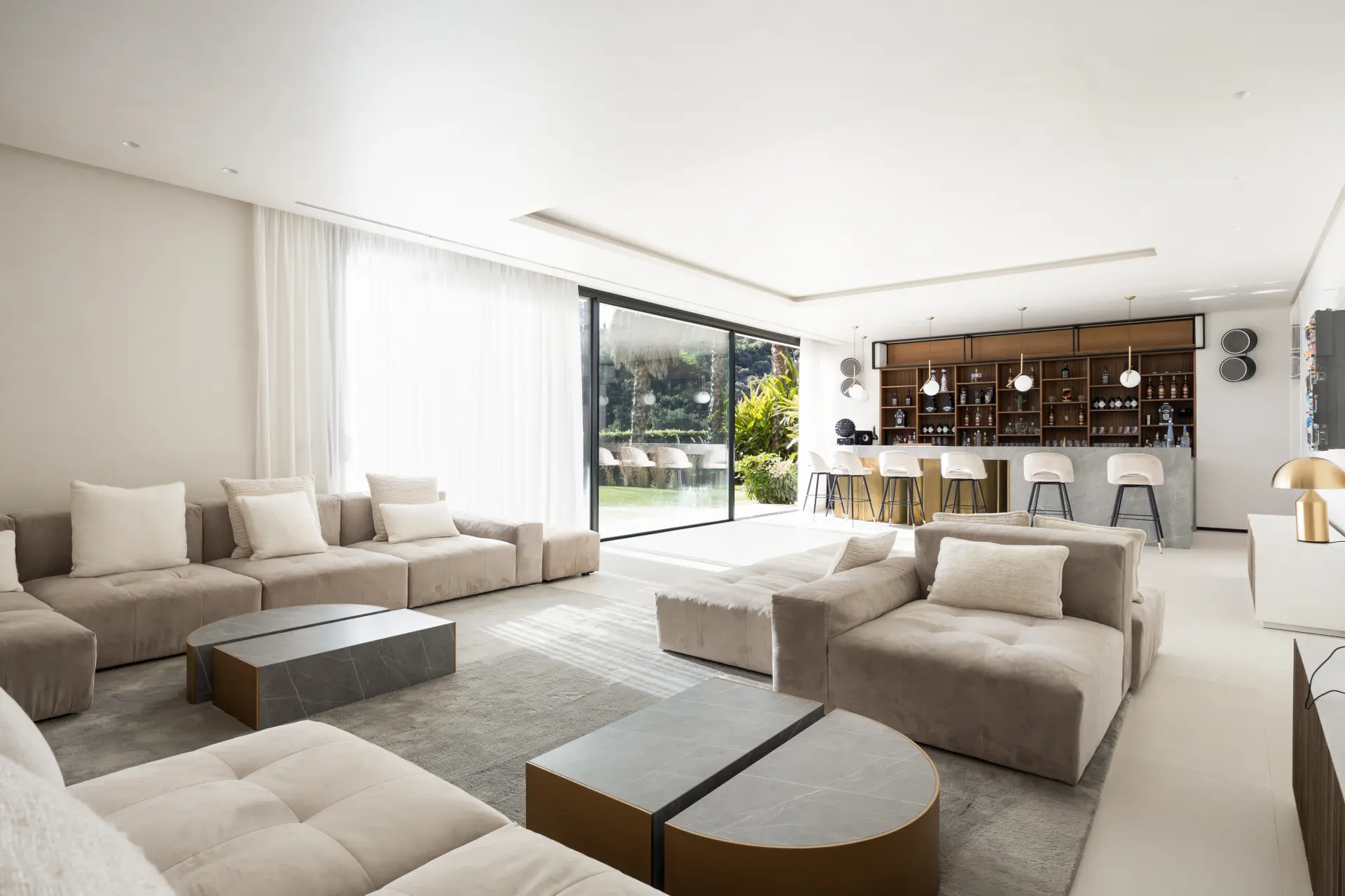 The lower level is designed as a secondary living area, incorporating leisure and guest accommodation. It includes a spa area with indoor pool, sauna and hammam, a gym, bar area, additional guest suites and a self-contained apartment with independent living space.