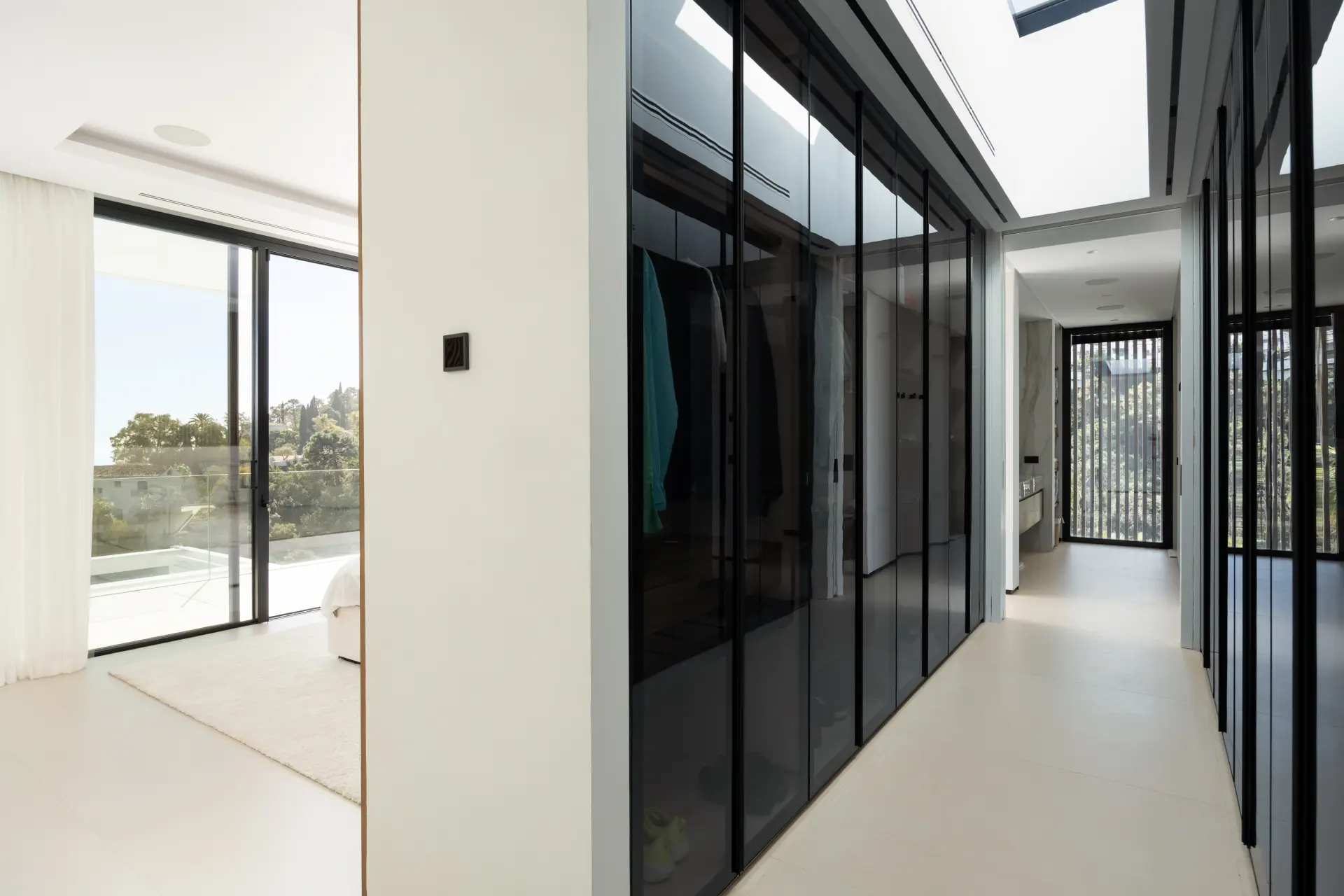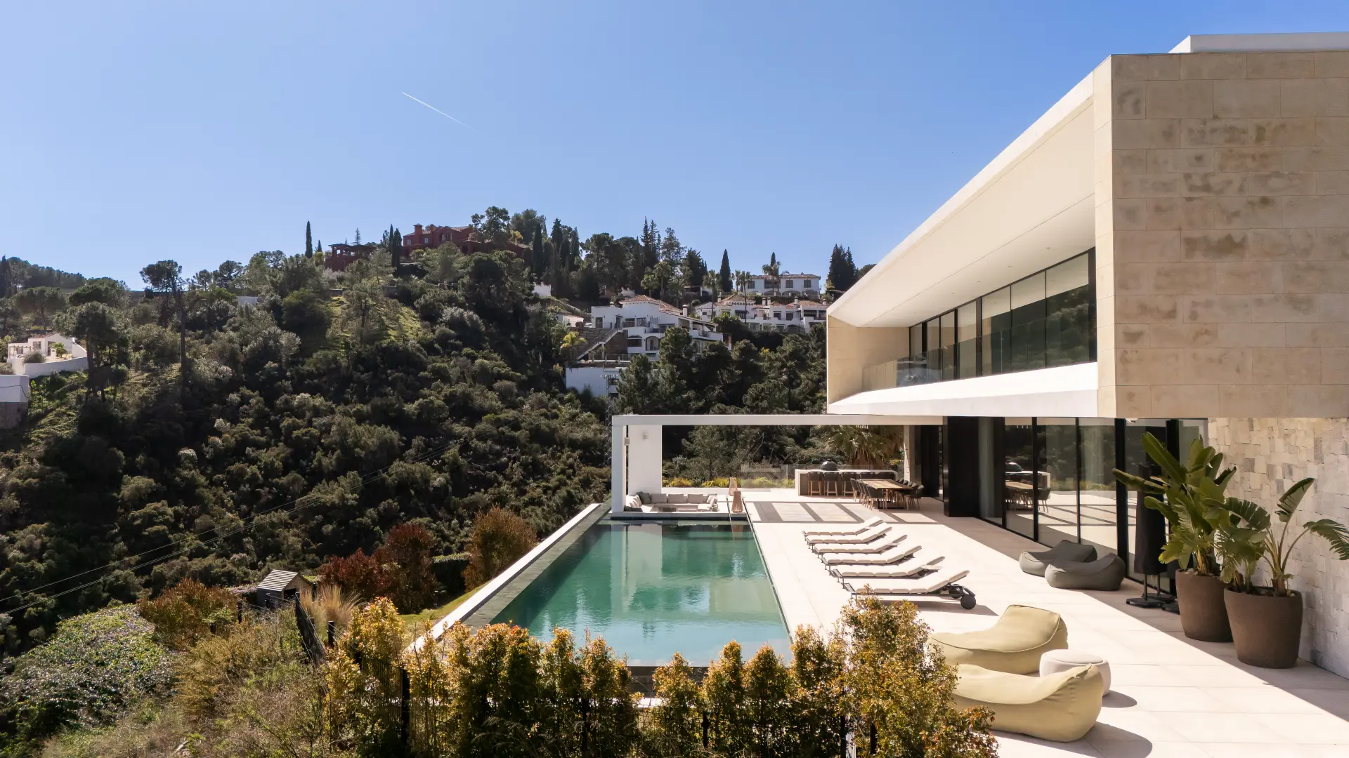 The house is organised around a central open-plan living space, where double-height ceilings and large-format windows bring light into the interior and frame the surrounding landscape. Living, dining and kitchen areas are connected and extend directly onto terraces and the pool, creating a clear relationship between indoor and outdoor spaces. A guest suite is positioned on this level.