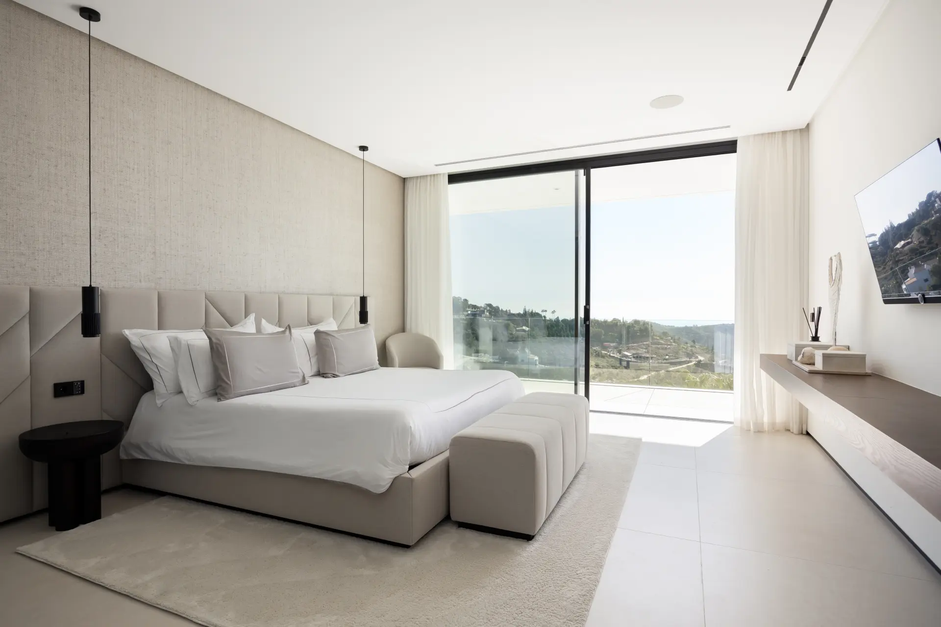 Outdoor areas are distributed across terraces and landscaped surroundings, with an infinity pool positioned to take advantage of the views. The property includes layered security systems and is located within a 24-hour gated environment, offering a balance between privacy, scale and accessibility to Marbella and the coast.