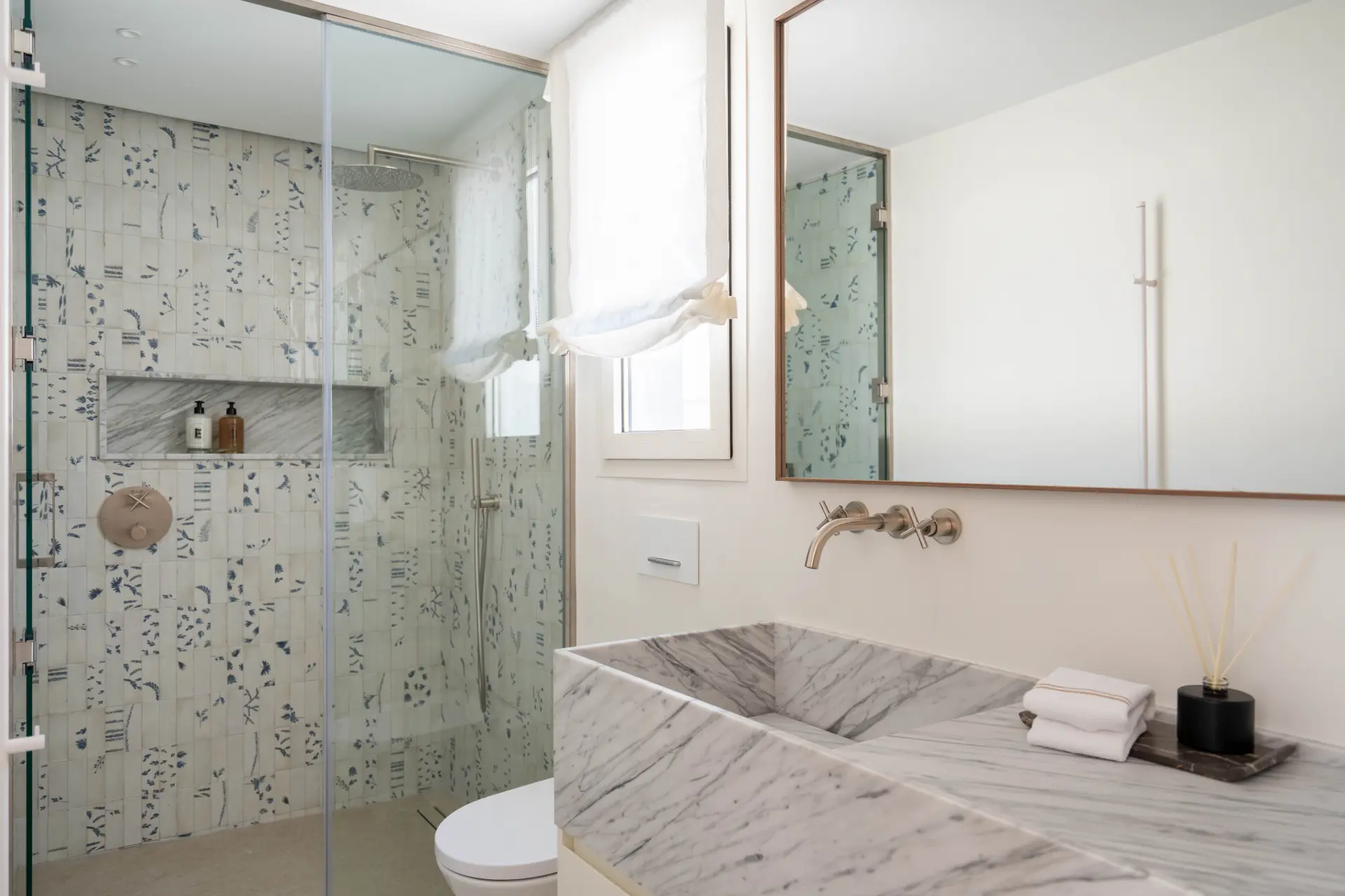 Upstairs, two additional bedroom suites enjoy panoramic sea views. The principal suite exudes Mediterranean charm, complete with en-suite bathroom and a chic walk-in closet, while the second suite opens onto a spacious terrace with a lounge and wet bar—the perfect setting to watch Marbella’s unforgettable sunsets.