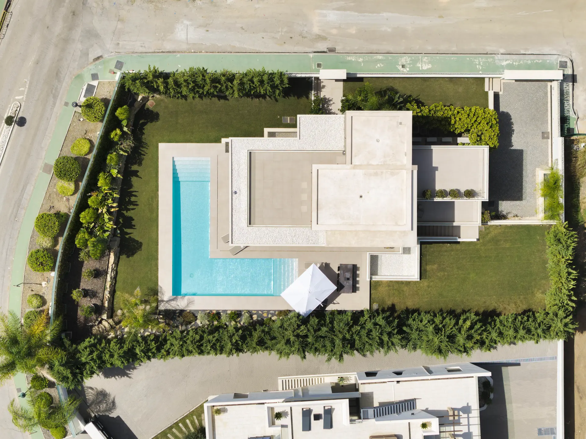Outside, the villa opens to a landscaped Mediterranean garden where olive trees, soft greenery, and curated lighting frame a peaceful atmosphere. The saltwater pool, with pre-installation for heating, sits at the centre of the outdoor living areas. Multiple covered and open terraces offer space for dining, lounging, or enjoying the southwest sun long into the afternoon.