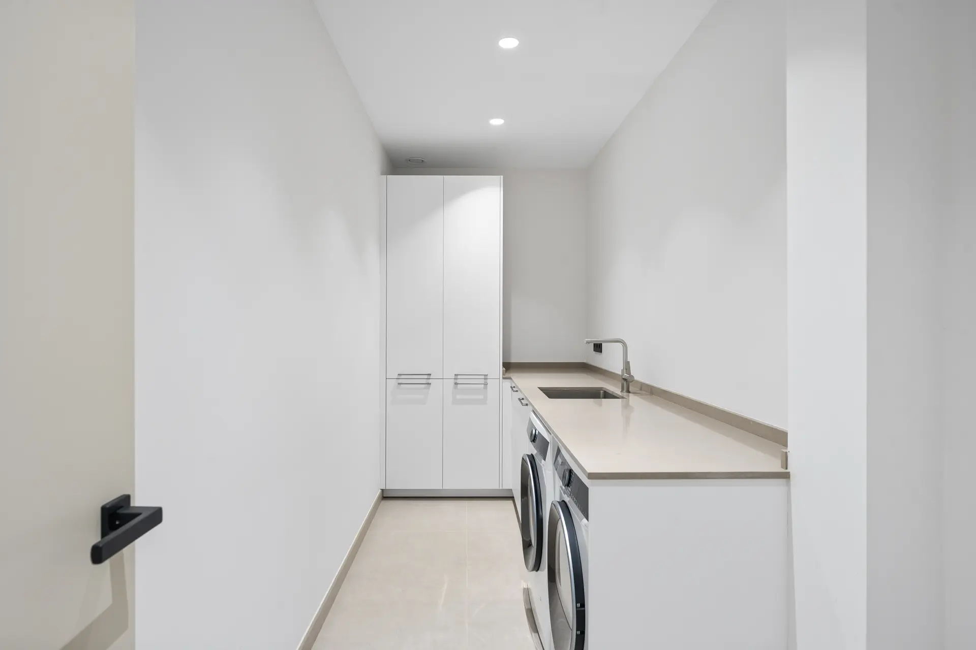 Across more than 770 m², the home unfolds with effortless balance. The main level centres around an open living space where the lounge, dining area, and contemporary kitchen connect naturally to the terraces and pool. Soft light, clean lines, and high-end finishes create a calm backdrop for both daily life and entertaining. A spacious guest suite on this floor adds convenience and privacy.