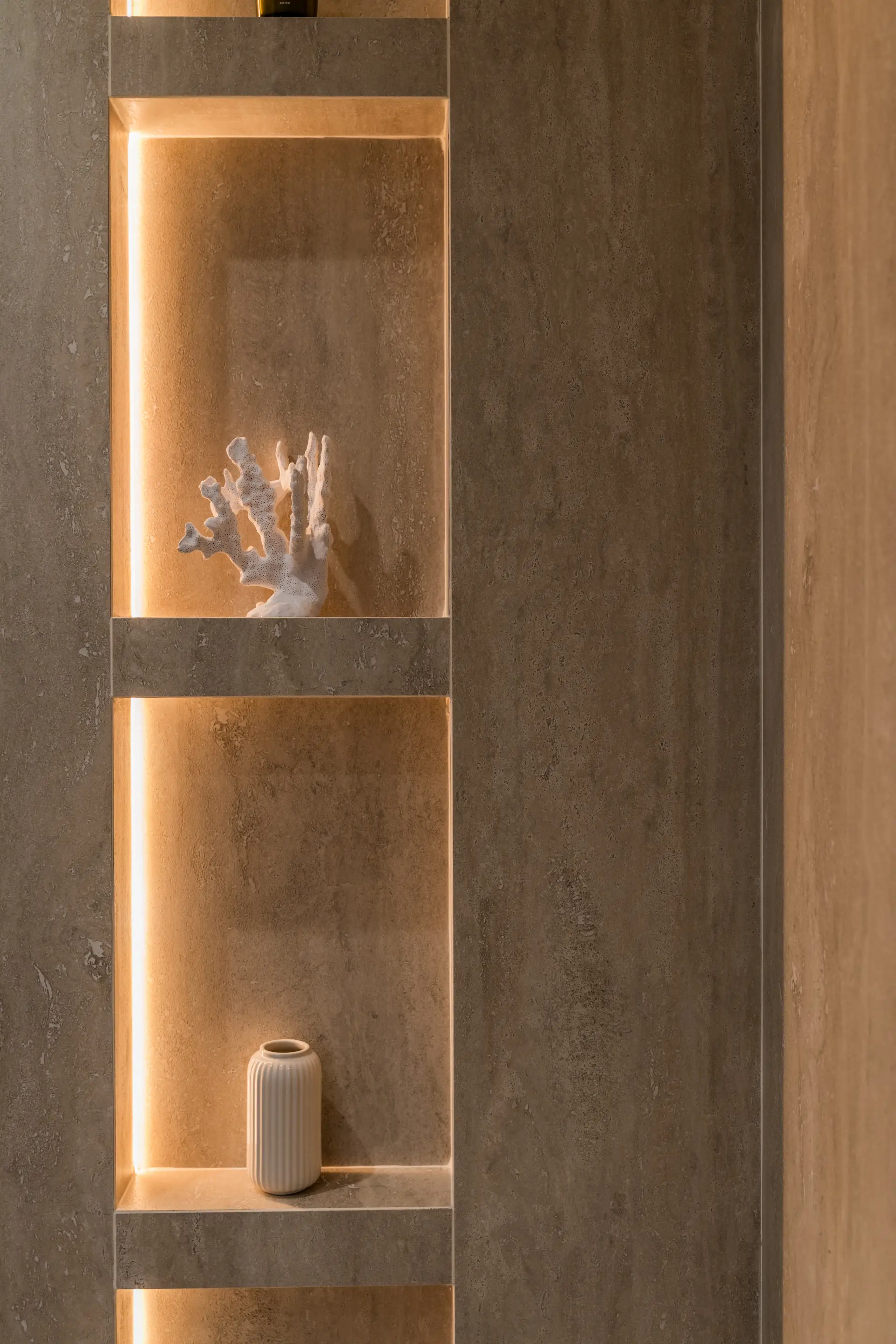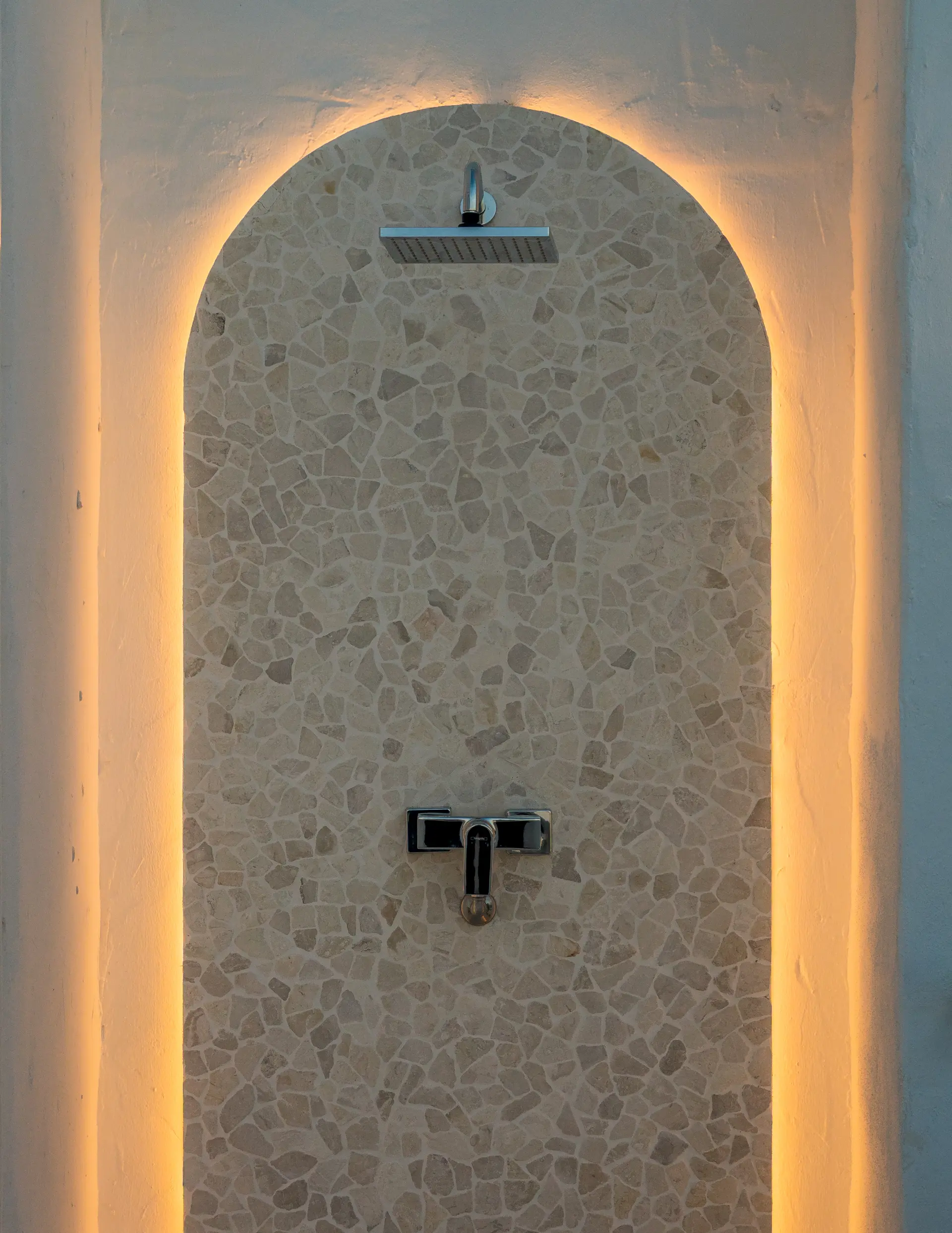 The upper floor comprises two additional en-suite bedrooms, each with direct access to private terraces. The principal suite includes a walk-in wardrobe and a larger terrace featuring a plunge pool and outdoor shower, positioned to maximise the uninterrupted sea views.