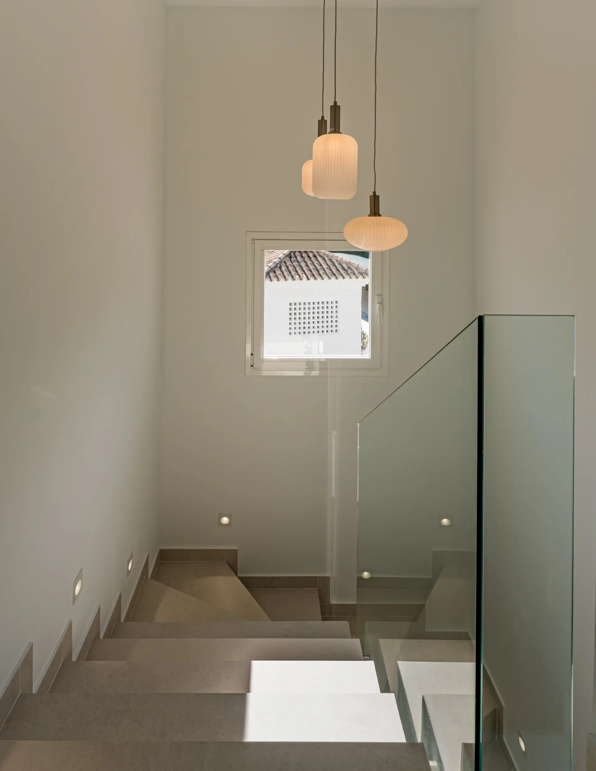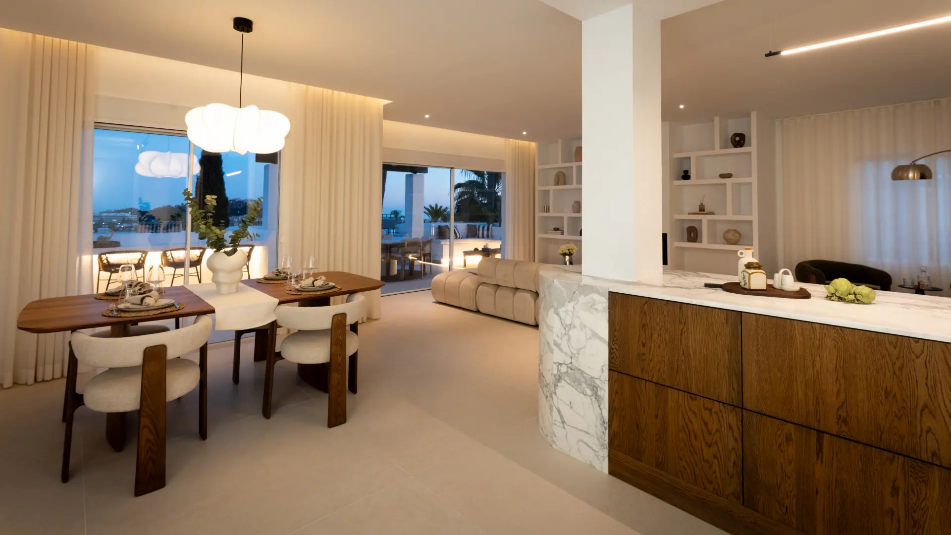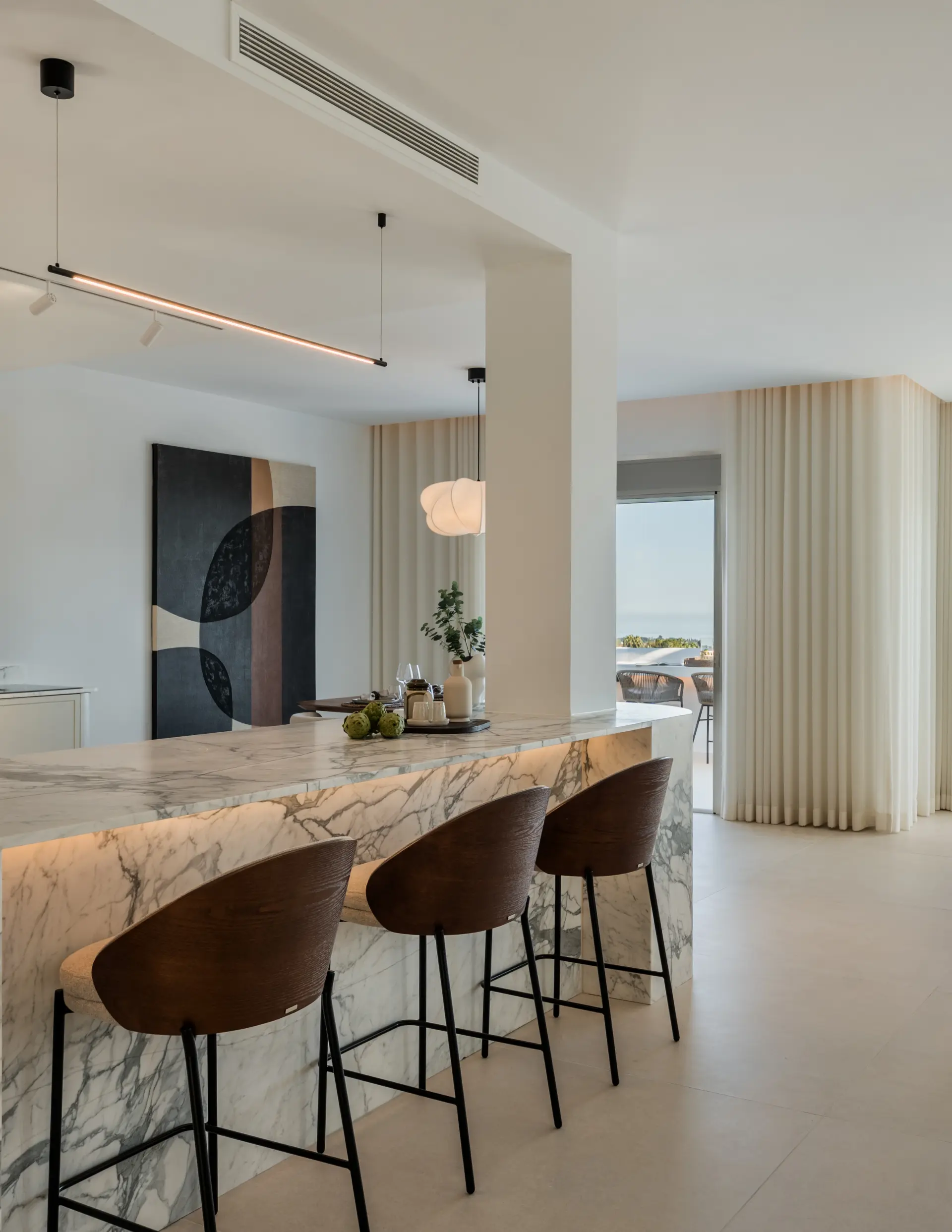 Distributed over two levels, the residence is defined by clarity of layout and natural light. The entrance floor presents an open-plan arrangement where kitchen, dining and living areas connect directly to a generous south-facing terrace, extending the interior toward the sea.