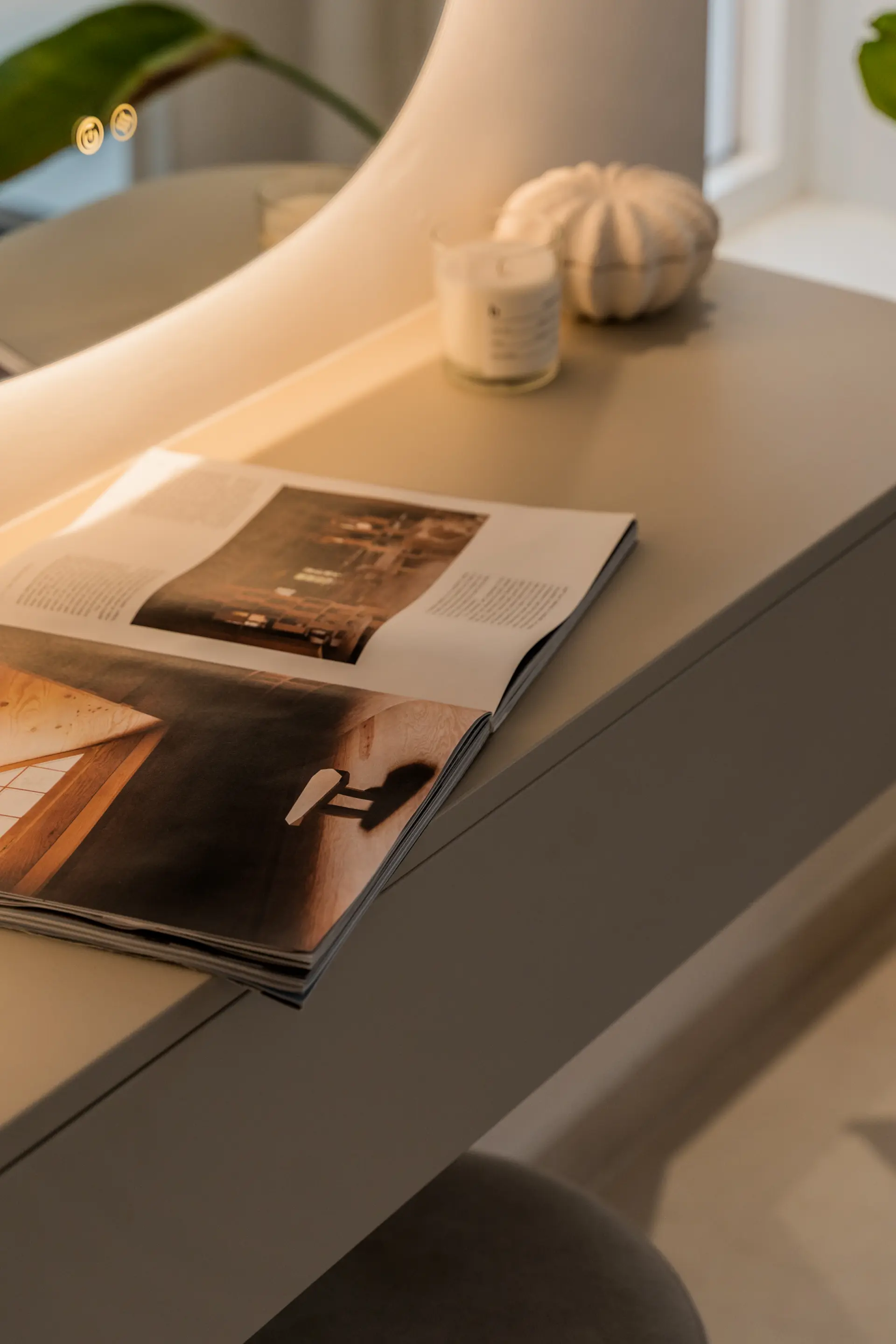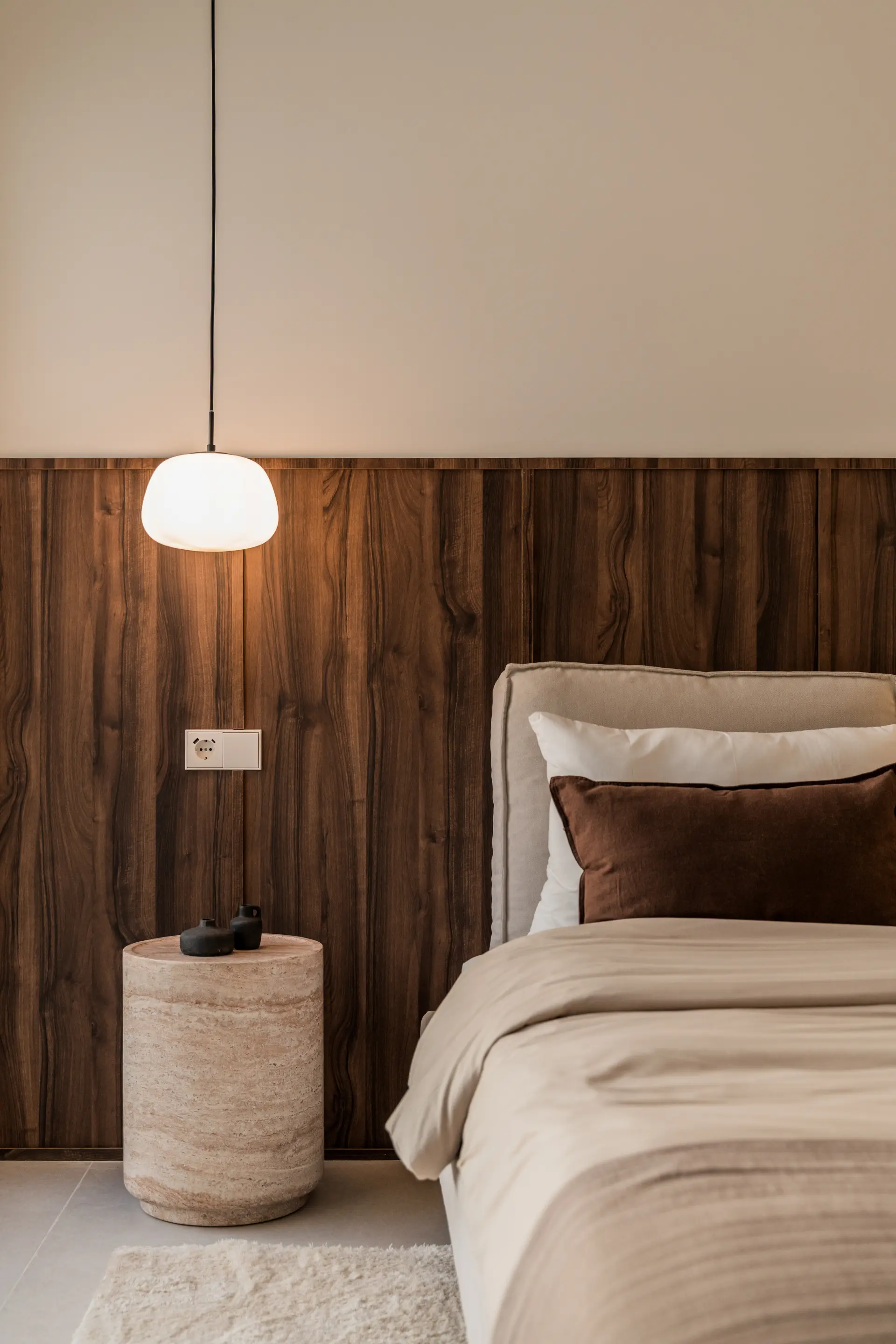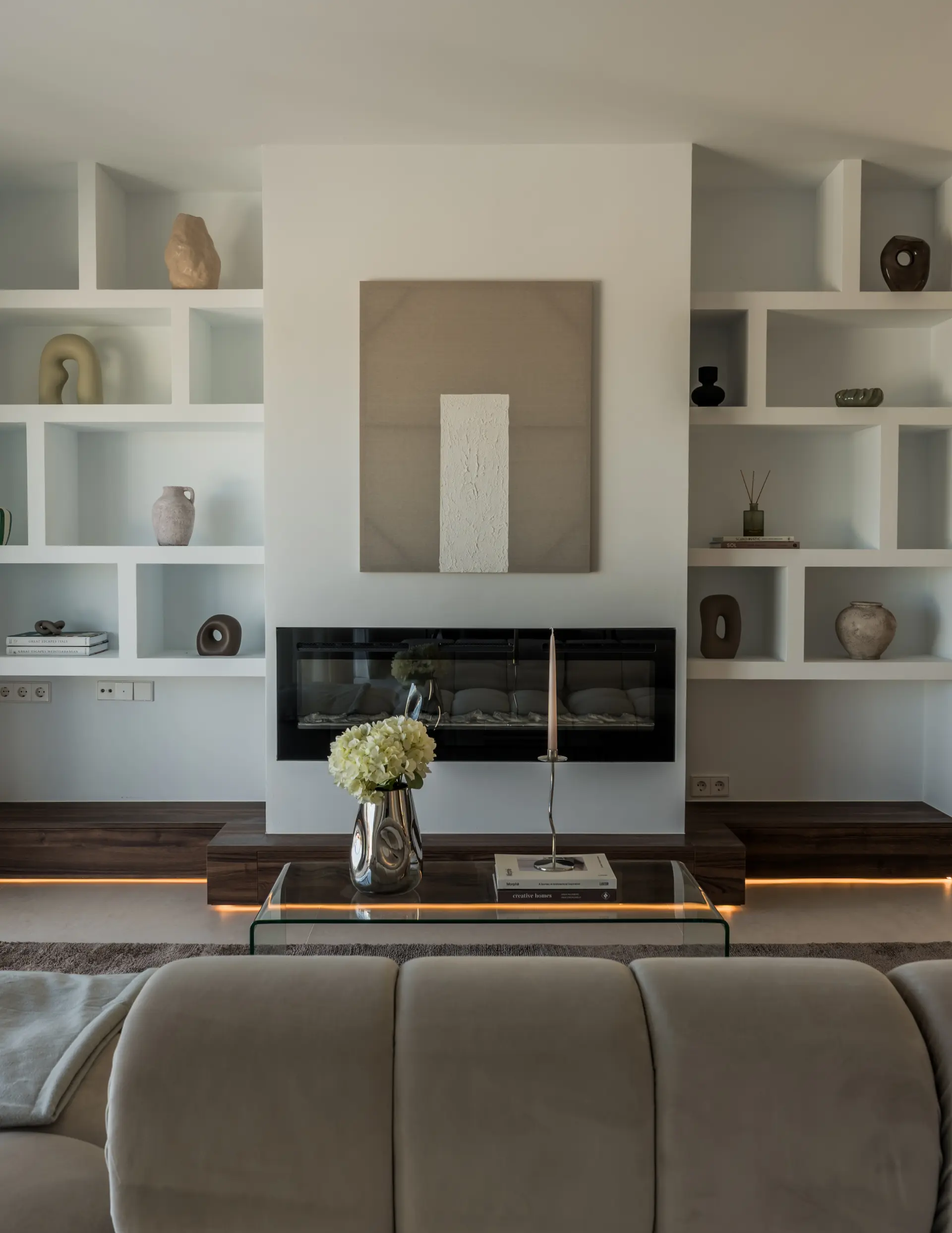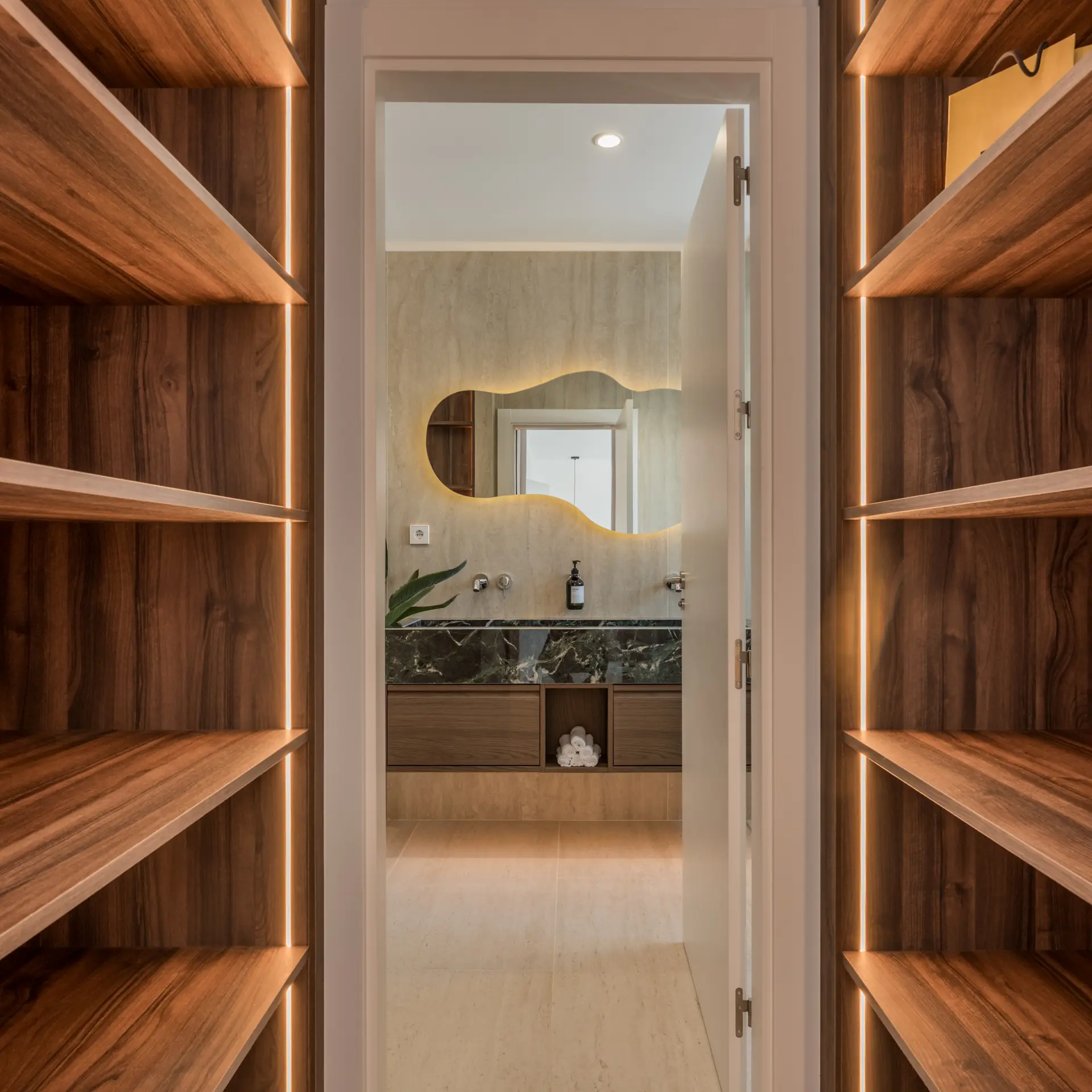 Distributed over two levels, the residence is defined by clarity of layout and natural light. The entrance floor presents an open-plan arrangement where kitchen, dining and living areas connect directly to a generous south-facing terrace, extending the interior toward the sea.
