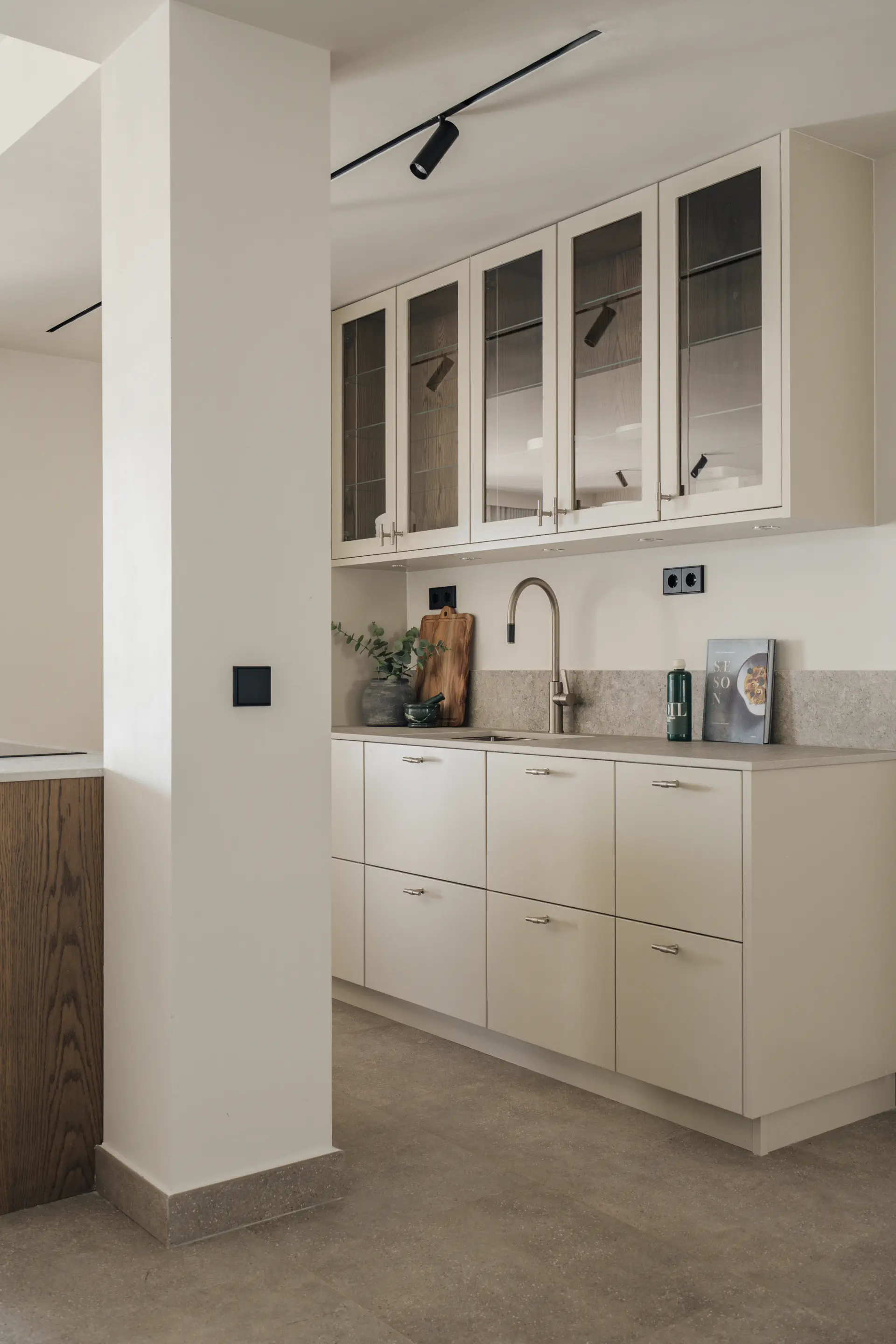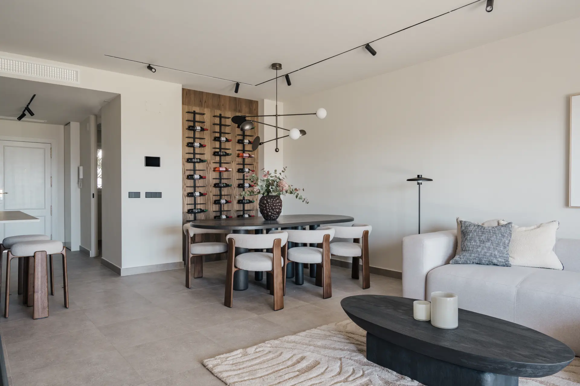 The layout is open and practical, with a modern kitchen and central island connecting directly to the living area. Large sliding doors extend the space onto a covered terrace and private garden, creating a natural indoor–outdoor flow.