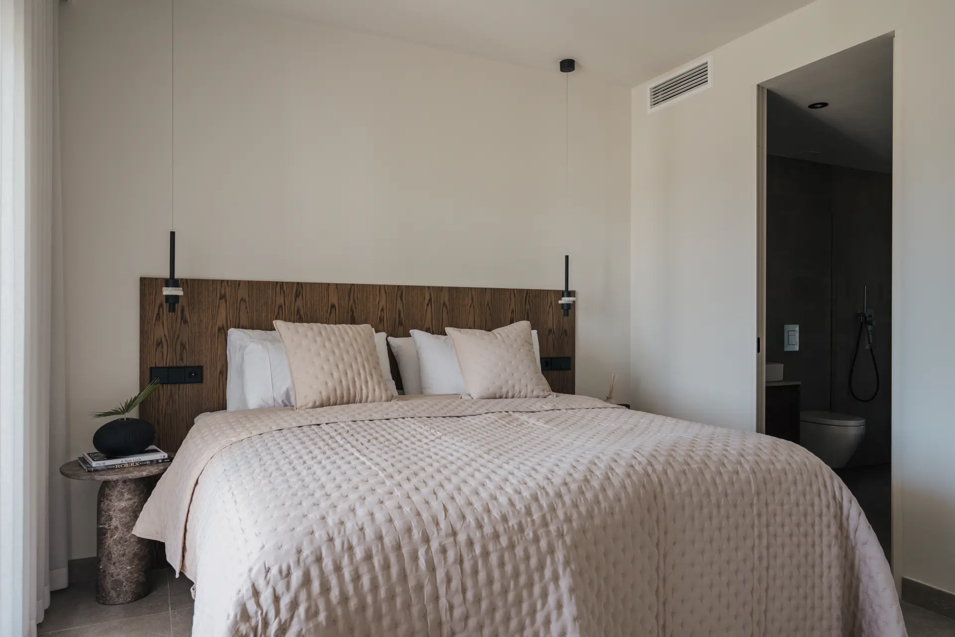 The main bedroom opens onto the terrace and includes an en-suite bathroom, while two additional bedrooms share a second bathroom, providing a balanced layout for family living or guests.