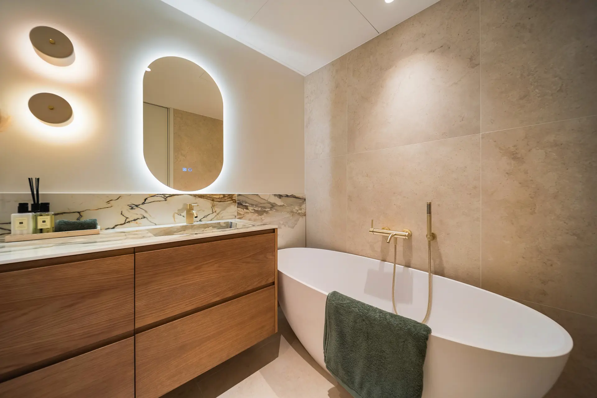 The apartment features three bedrooms and two bathrooms, along with an additional guest powder room. Clean lines, contemporary finishes, and carefully selected materials create a calm and modern atmosphere throughout, resulting in a home that is both elegant and practical for everyday living.