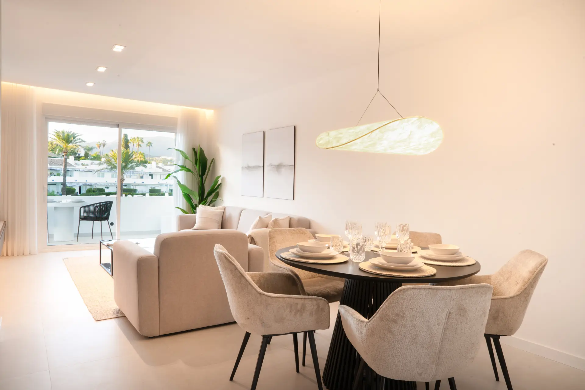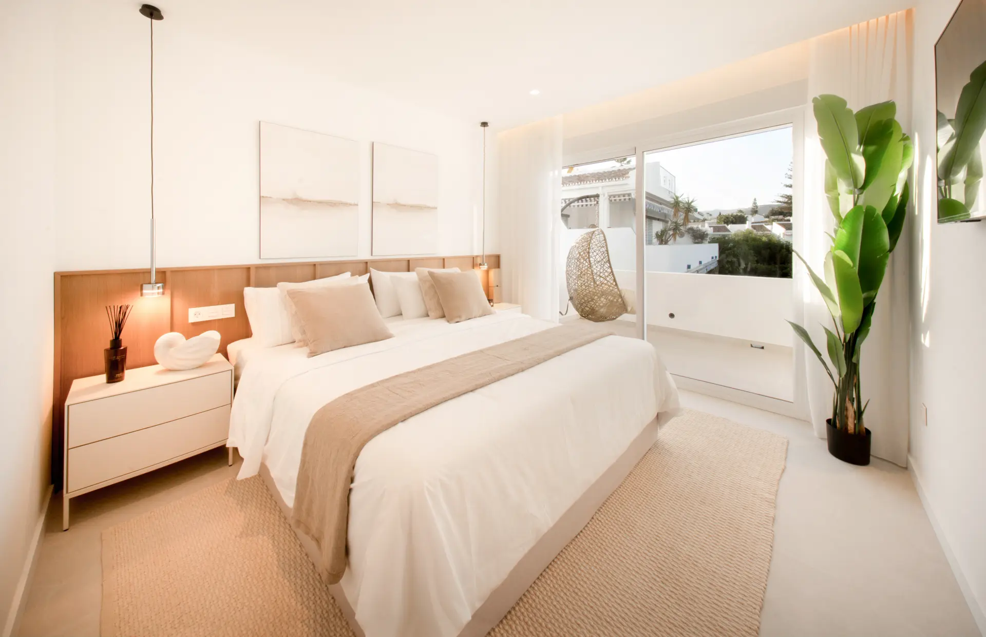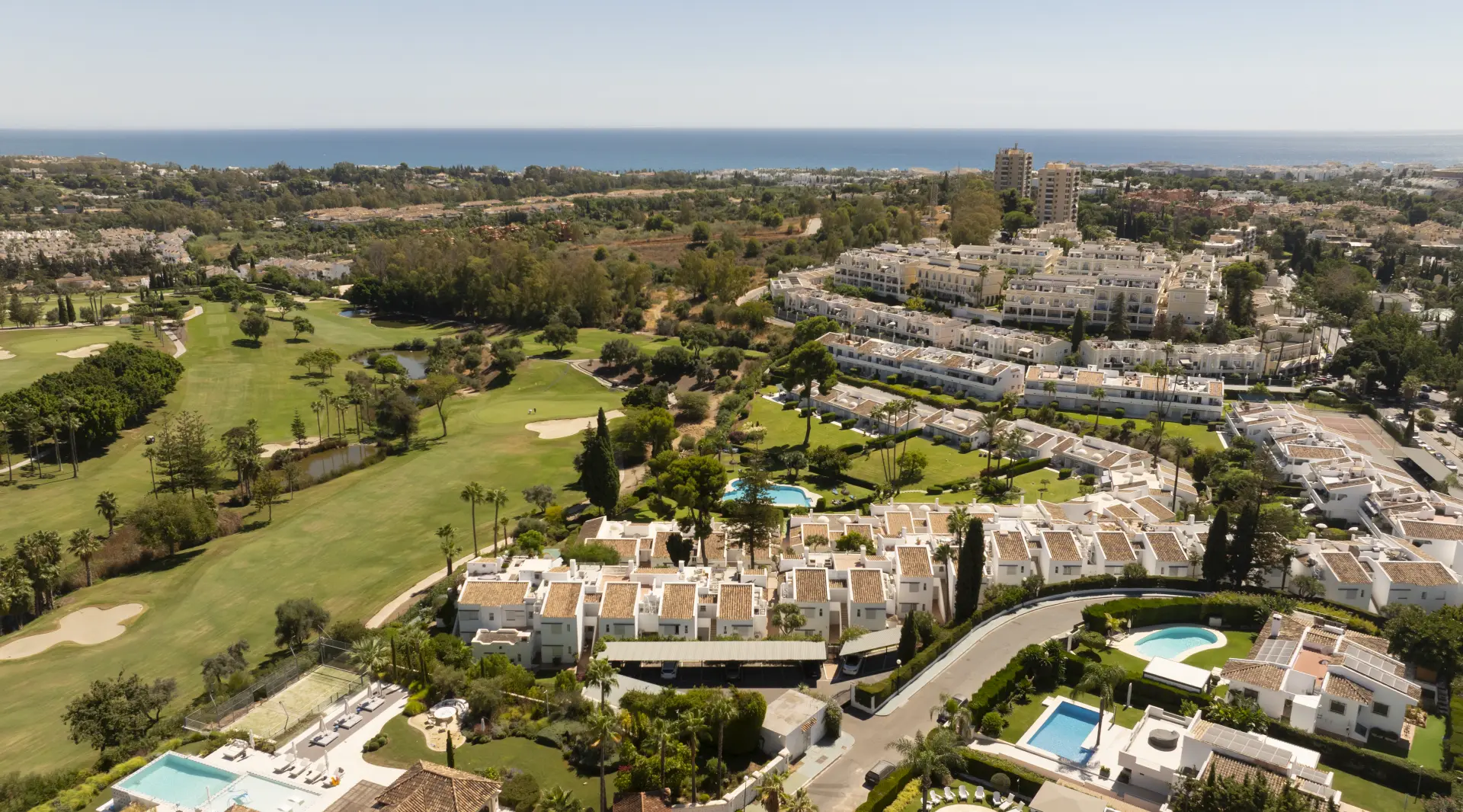 In the heart of Marbella’s Golf Valley, this renovated duplex penthouse combines modern Scandinavian-inspired interiors with the best of Mediterranean living. The home sits within a secure gated community that offers residents access to a gym, spa, swimming pool, and tennis and padel courts, all surrounded by landscaped gardens.