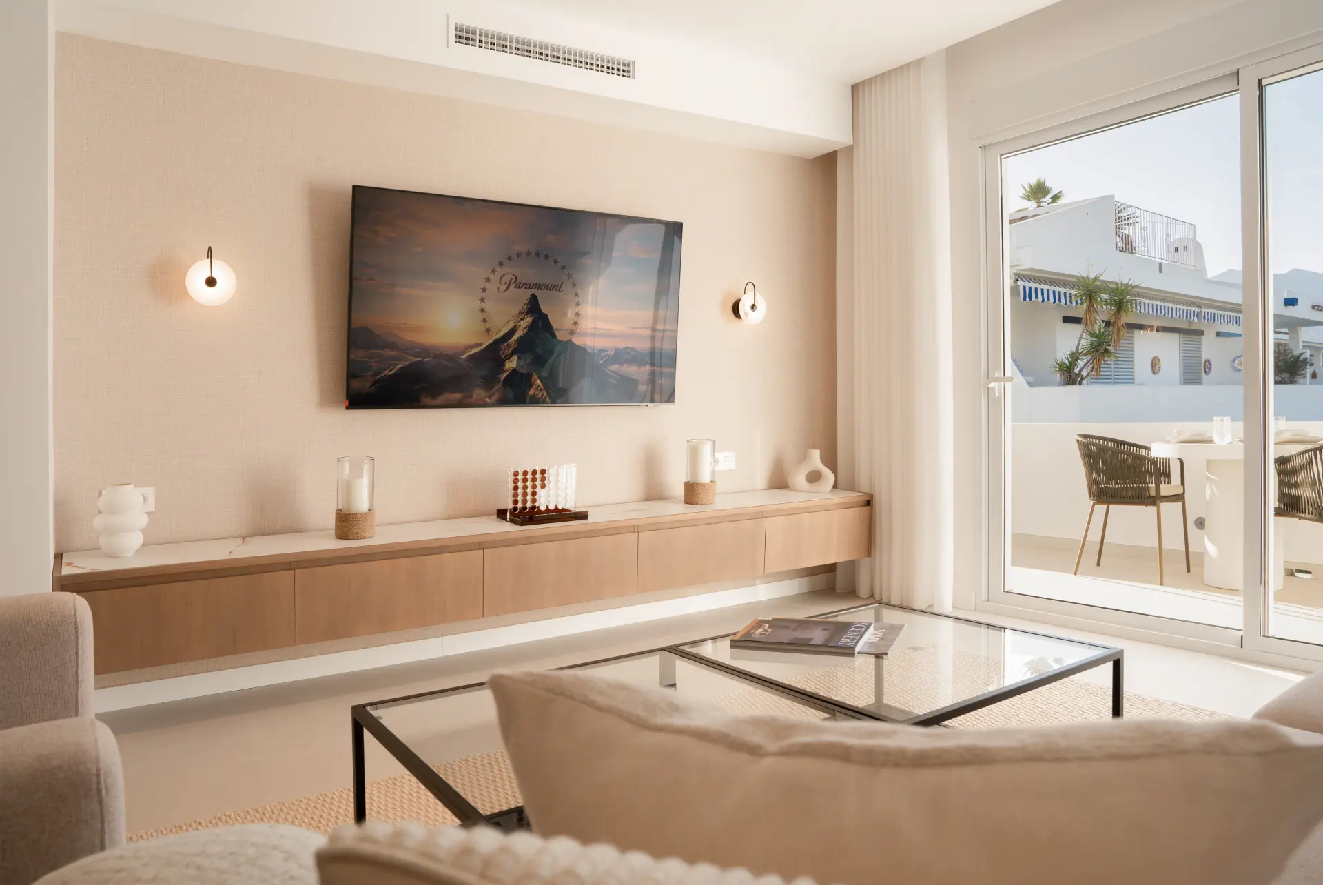 The main level features an open-plan living and dining area filled with natural light, flowing onto a spacious terrace perfect for lounging or dining outdoors. A sleek fitted kitchen with contemporary appliances complements the space, while two bedrooms with en-suite bathrooms provide comfort and privacy.