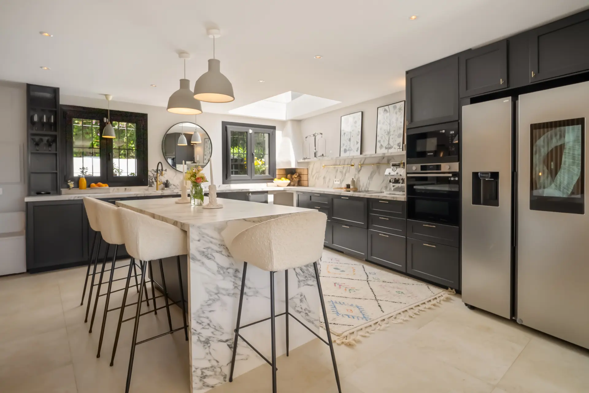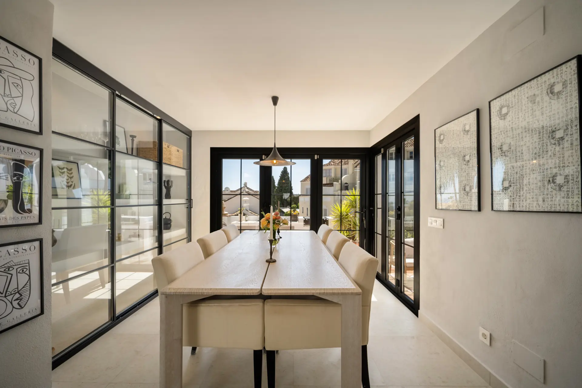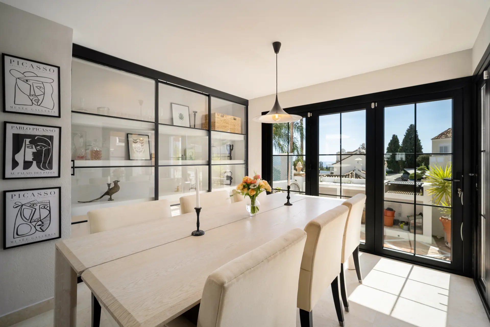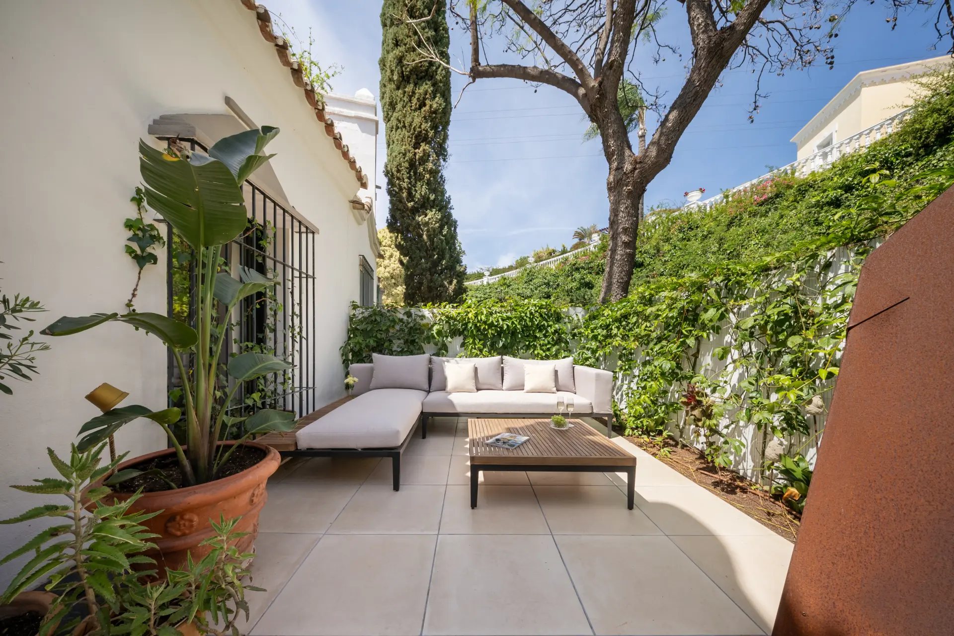 Renovated townhouse on Marbella’s Golden Mile, combining traditional Andalusian architecture with contemporary Nordic interiors, set within a gated community close to beaches, schools and amenities.