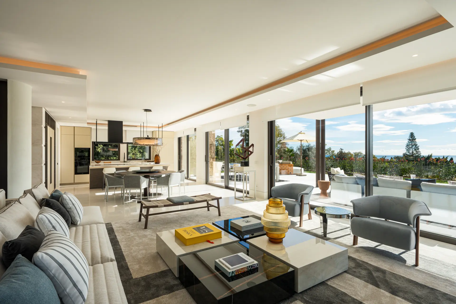 The interior is defined by a calm and consistent design, with natural materials such as wood and marble used throughout. Open-plan living areas are arranged with clear zones for dining and relaxation, creating a layout that feels both connected and structured. The kitchen is modern and functional, equipped for both everyday use and hosting.