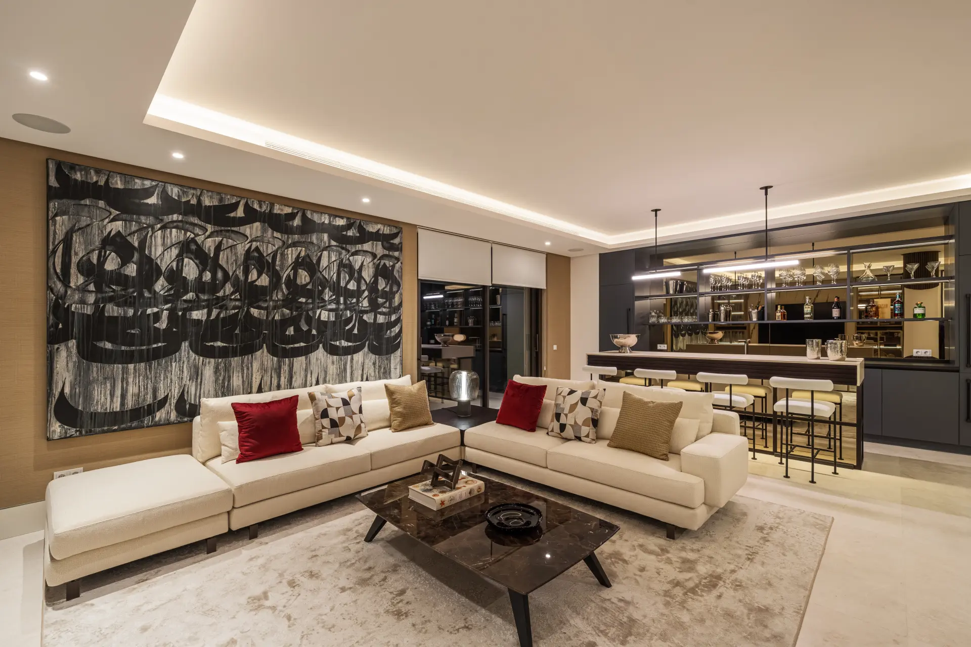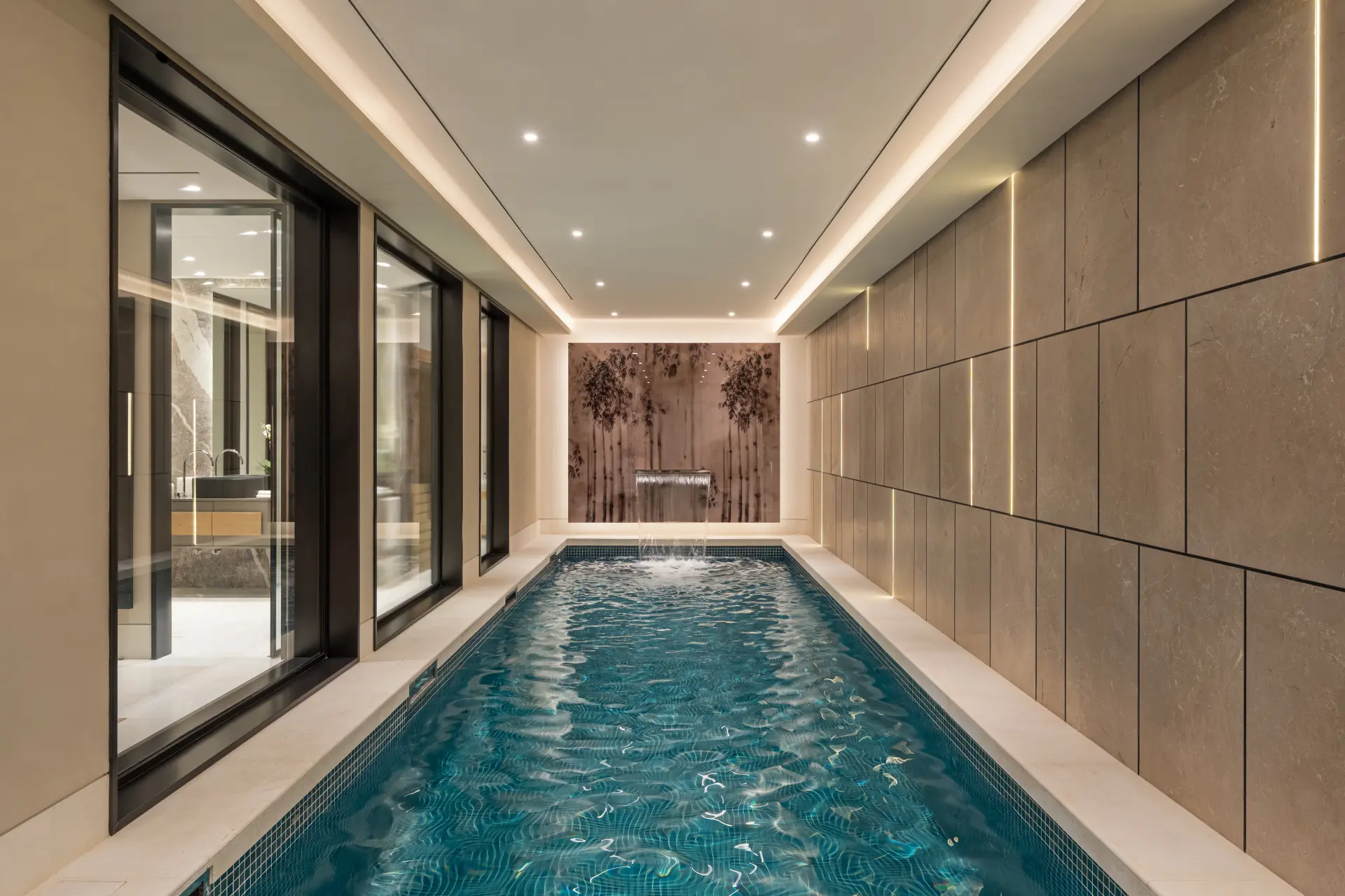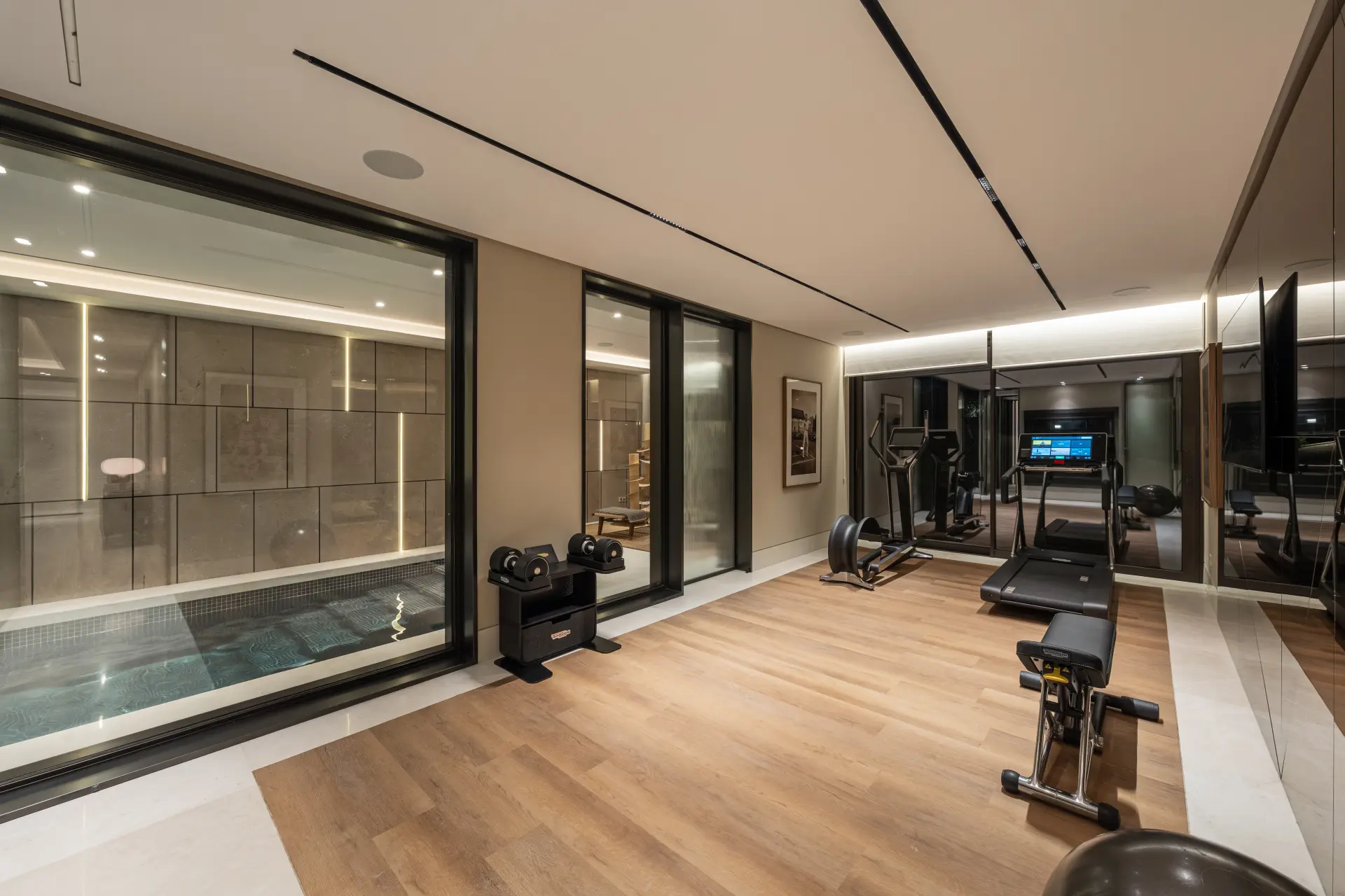 Leisure and wellness are integrated into the home, including an indoor pool, gym, Turkish bath and a dedicated entertainment and bar area. These spaces are positioned for regular use, extending the functionality of the property beyond the main living areas.