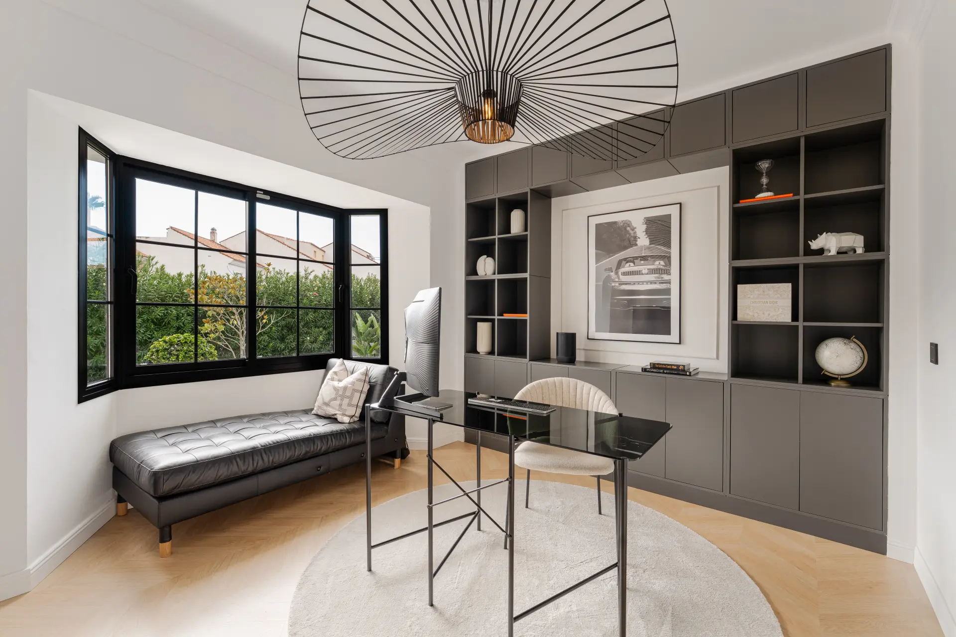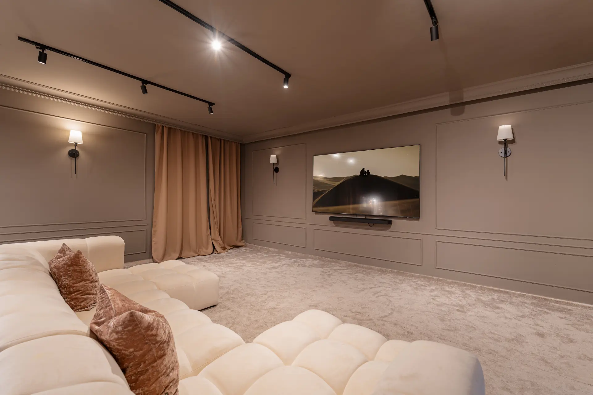 Inside, an open-plan layout connects the Italian marble kitchen with Gaggenau appliances to the dining and living areas, opening directly to the terraces and pool. The main level includes a guest bedroom and a home office, while the upper floor is home to the master suite and two further bedrooms with serene garden views. The basement features a home cinema and an additional guest suite, ideal for entertaining or visitors.