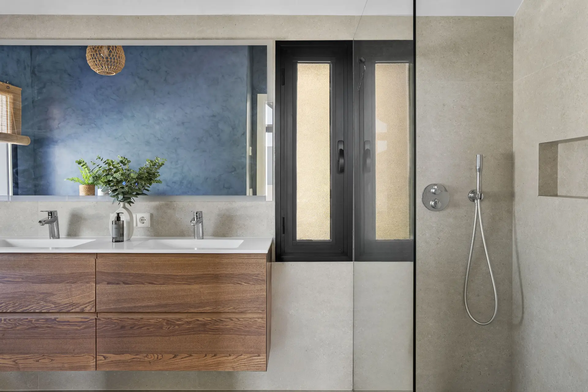 The upper floor is dedicated to privacy, featuring two en-suite bedrooms with direct access to a sunlit terrace. These spaces are calm and well-proportioned, designed to maximise comfort while maintaining a strong connection to the outdoors.