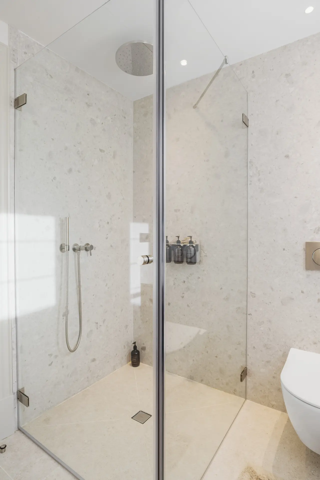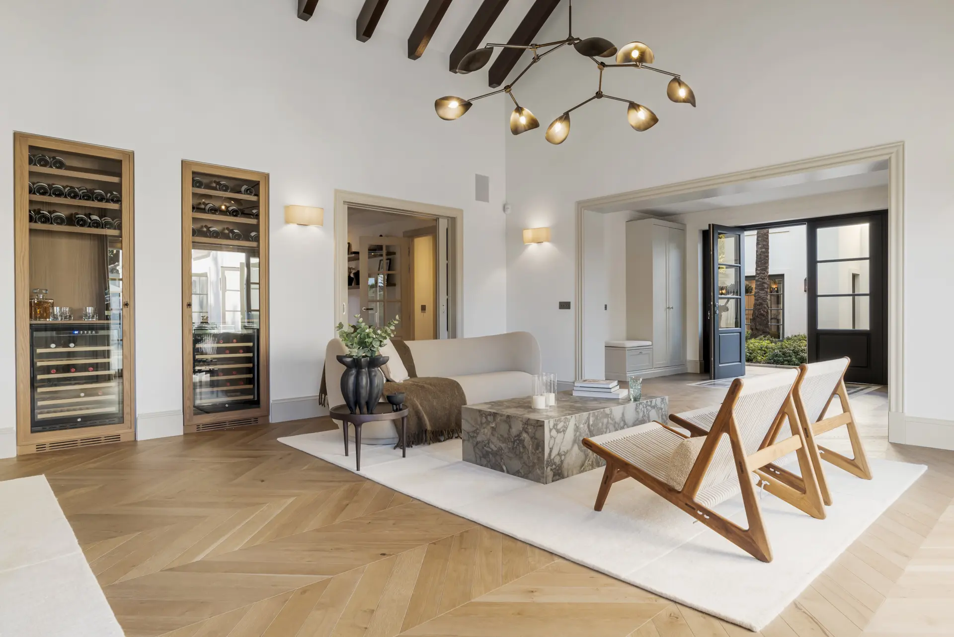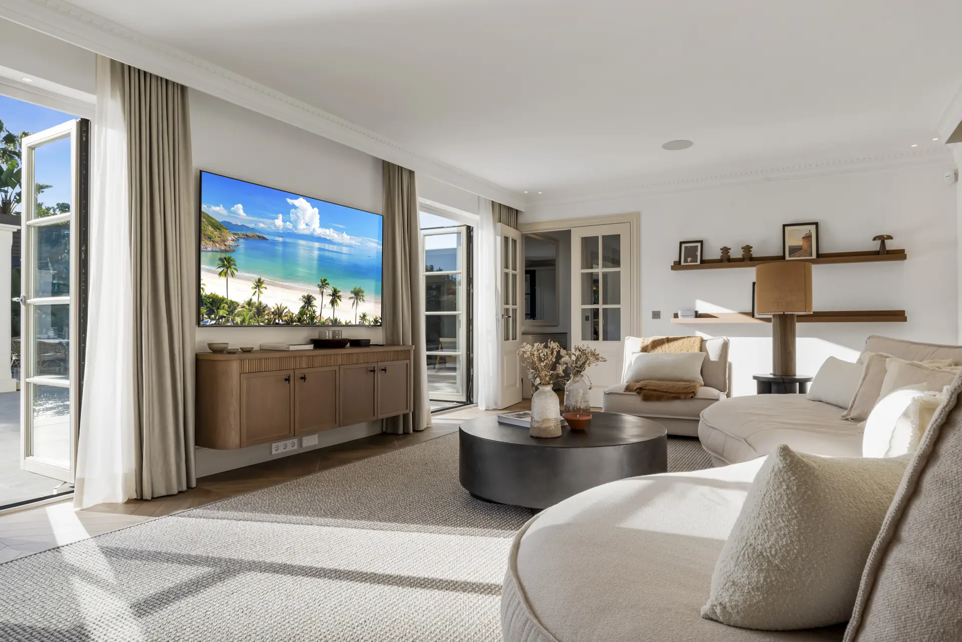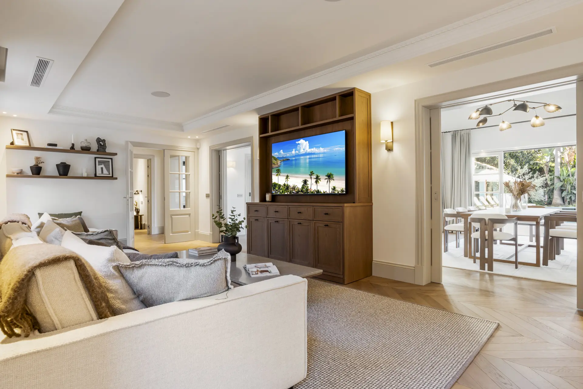 The main living area is arranged in an open-plan format, where kitchen, dining and lounge flow directly onto the terraces. The bespoke kitchen is designed for practical use, while the overall layout maintains a clean and balanced composition with natural materials and subtle detailing.