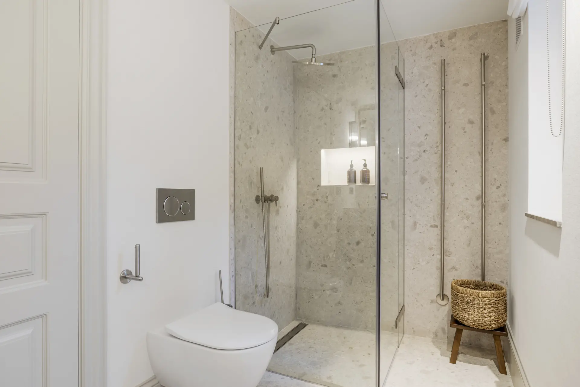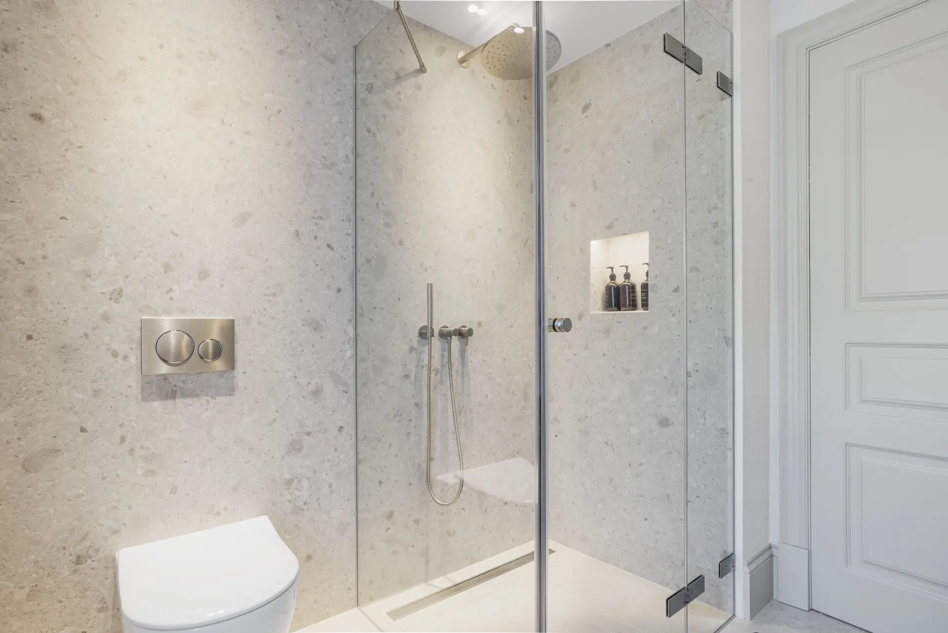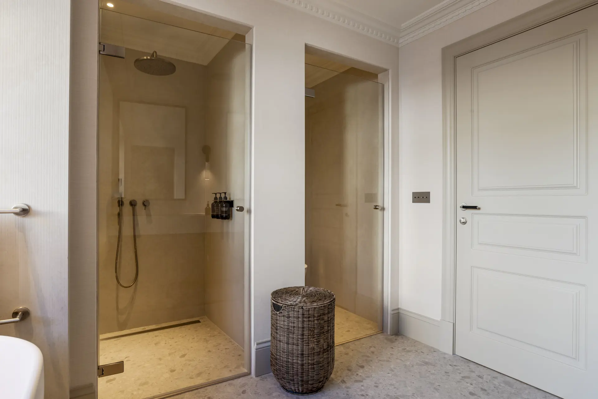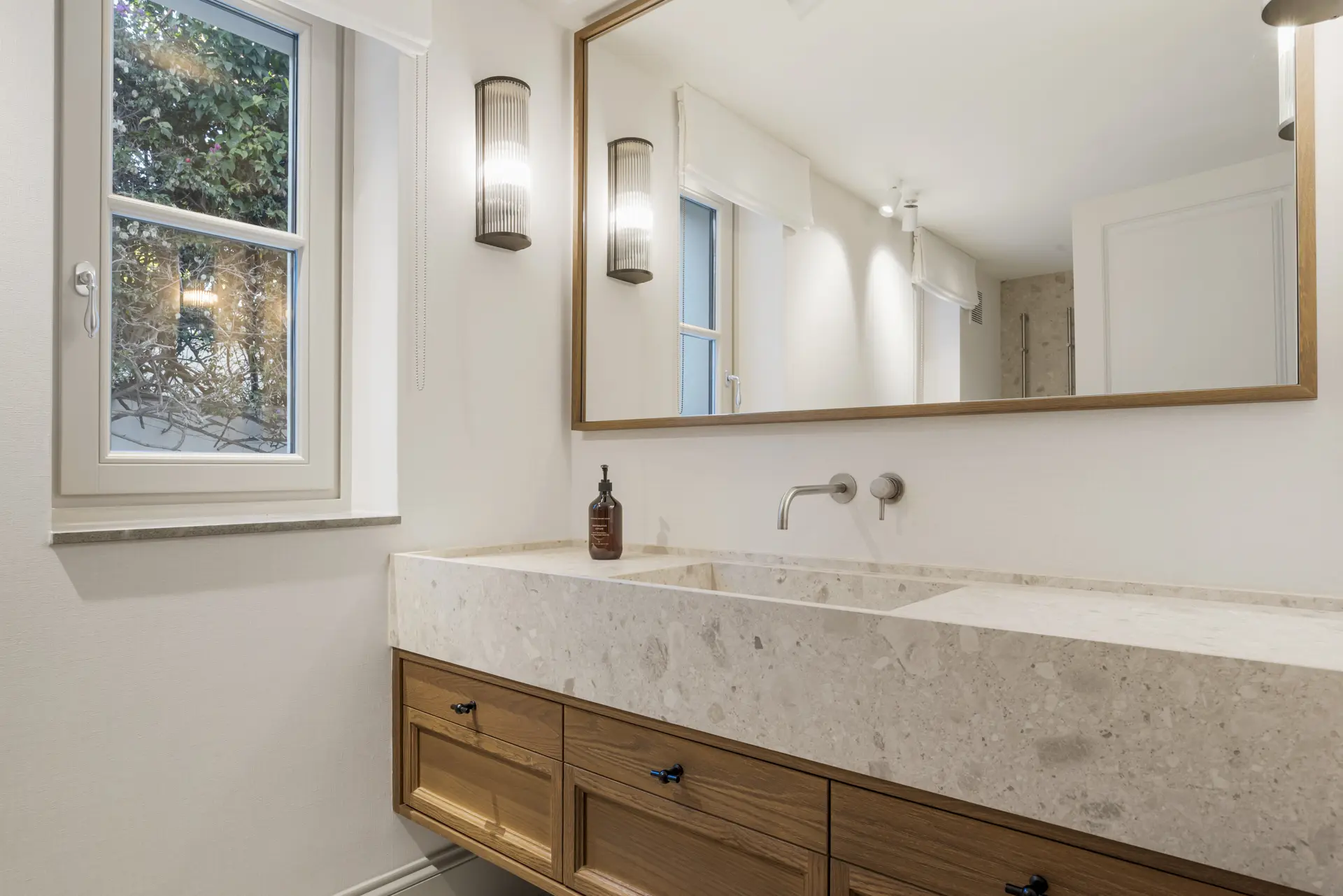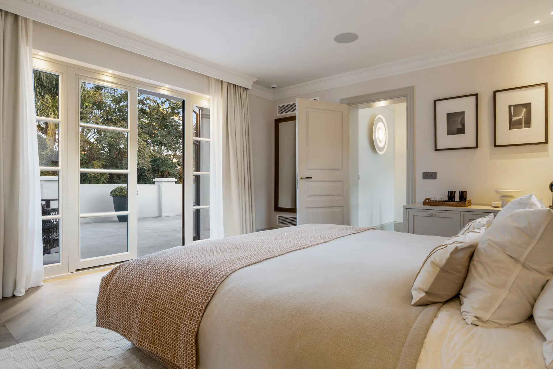 The main living area is arranged in an open-plan format, where kitchen, dining and lounge flow directly onto the terraces. The bespoke kitchen is designed for practical use, while the overall layout maintains a clean and balanced composition with natural materials and subtle detailing.
