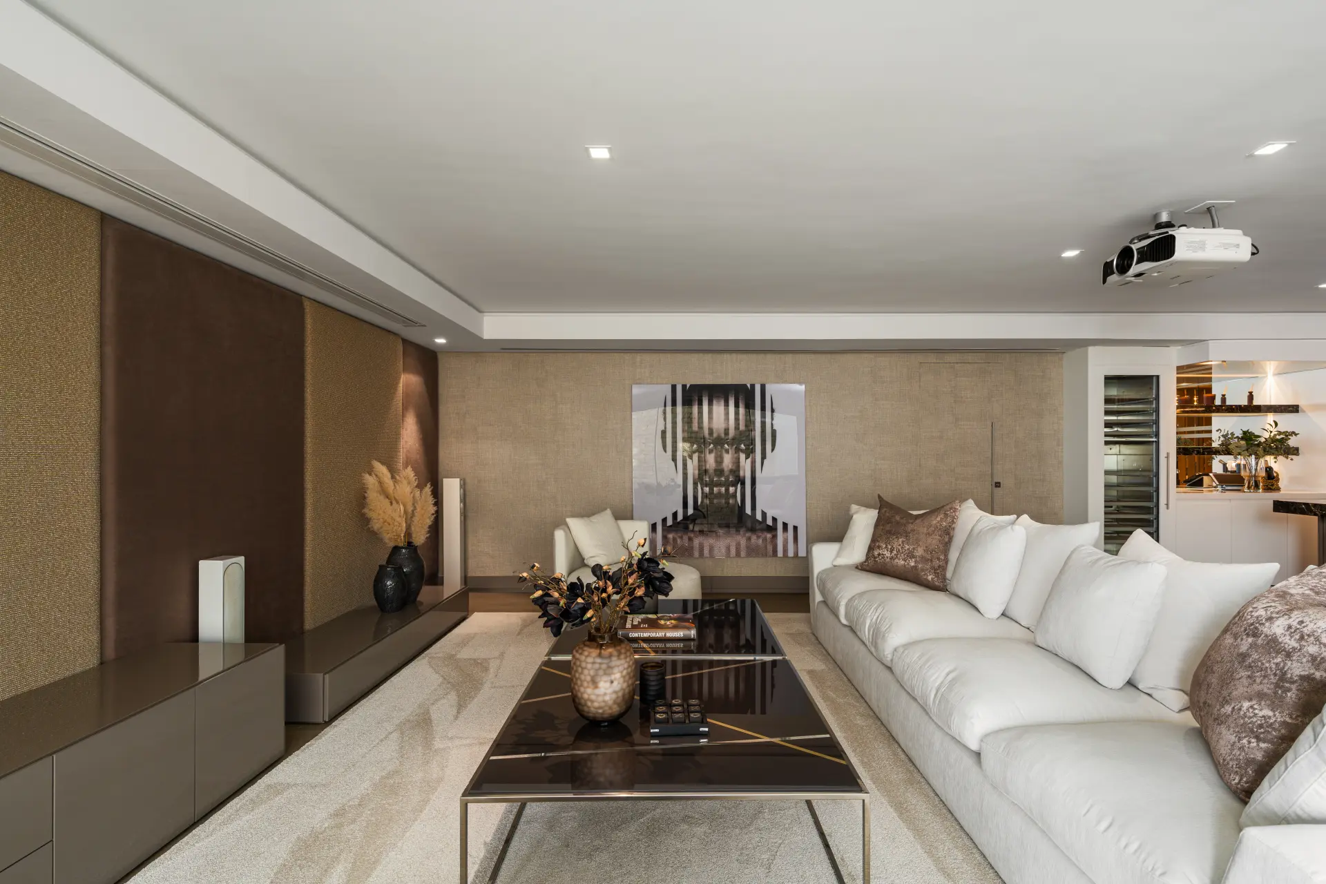 The lower level accommodates leisure and wellness amenities, including an entertainment room with bar, cinema area with projector, gym, and sauna. By positioning these features separately, the primary living areas remain composed and uncluttered.