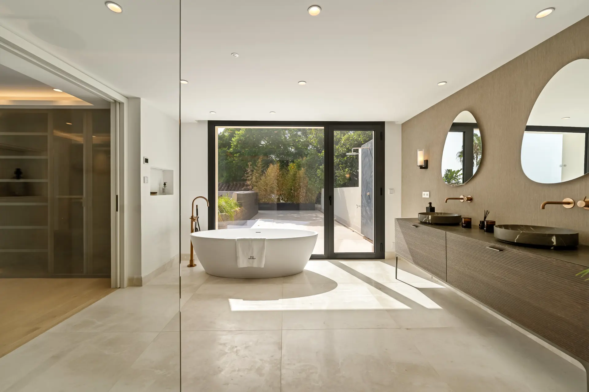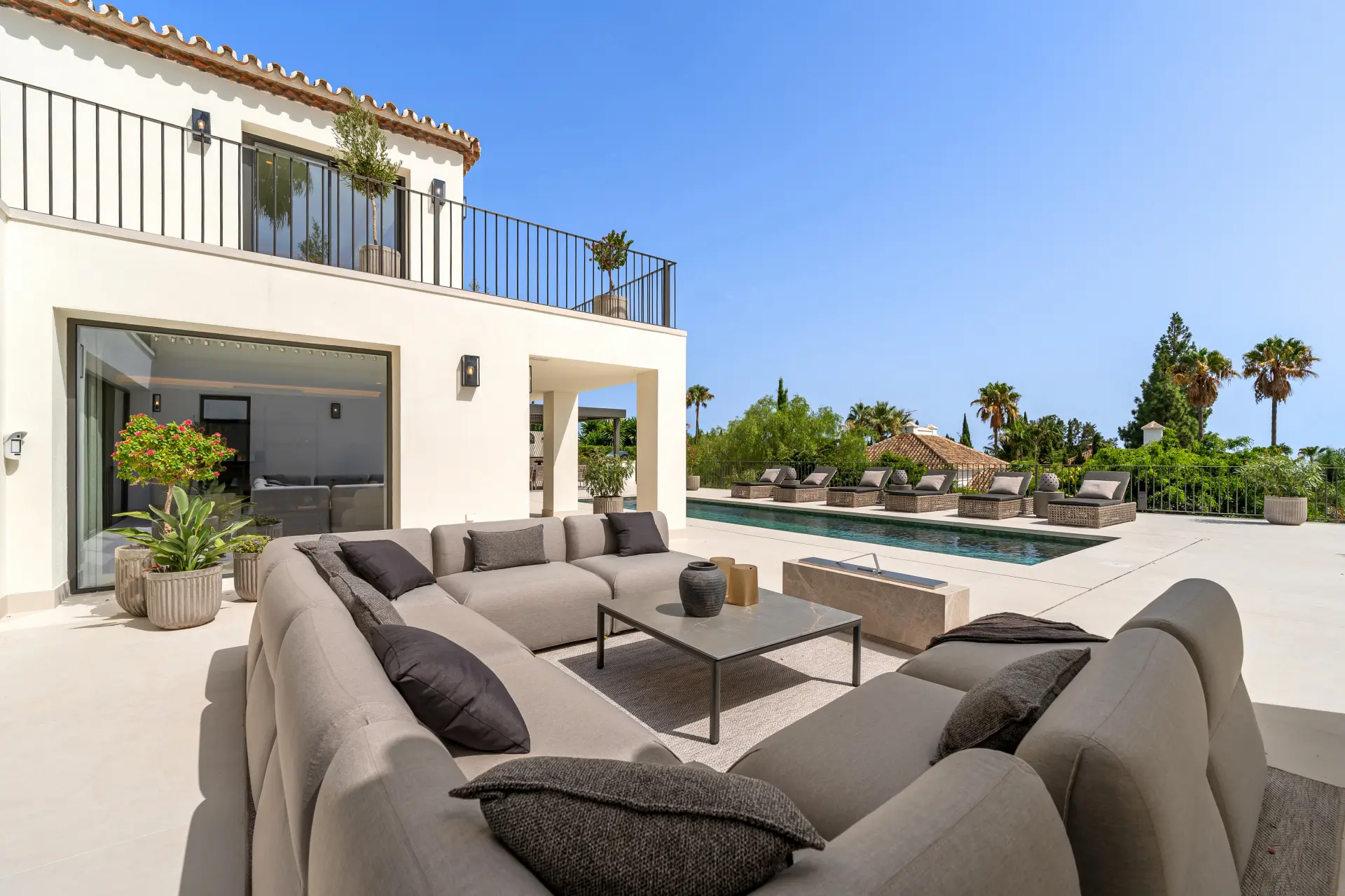 Villa Rocío is a fully renovated Andalusian-style residence located in the exclusive Rocío de Nagüeles area on Marbella’s Golden Mile. Set on a 1,965 m² south-facing plot at the foot of La Concha, the villa enjoys open views over the Mediterranean and was modernised in 2025 to offer 734 m² of light-filled living space. Floor-to-ceiling windows, vaulted ceilings, and seamless indoor-outdoor flow ensure the interiors are bright and inviting while framing the stunning surroundings.