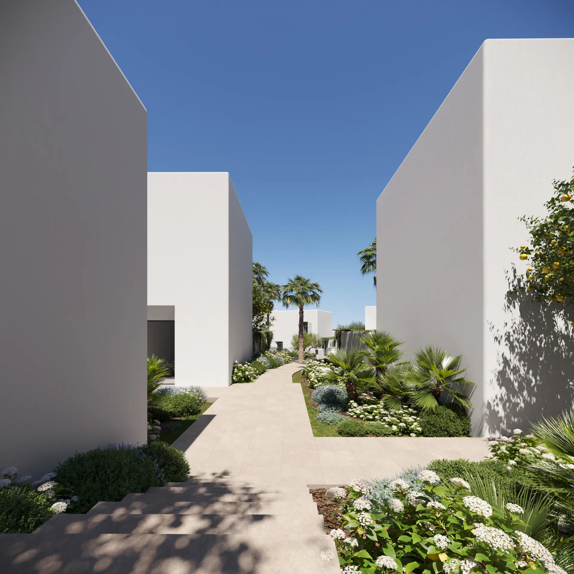 The development presents a carefully curated selection of homes designed to embrace the essence of contemporary Mediterranean living. Architecture by the renowned studio Torras y Sierra reflects a modern interpretation of traditional Andalusian design, defined by clean white façades, balanced proportions and a seamless relationship between indoor and outdoor spaces.